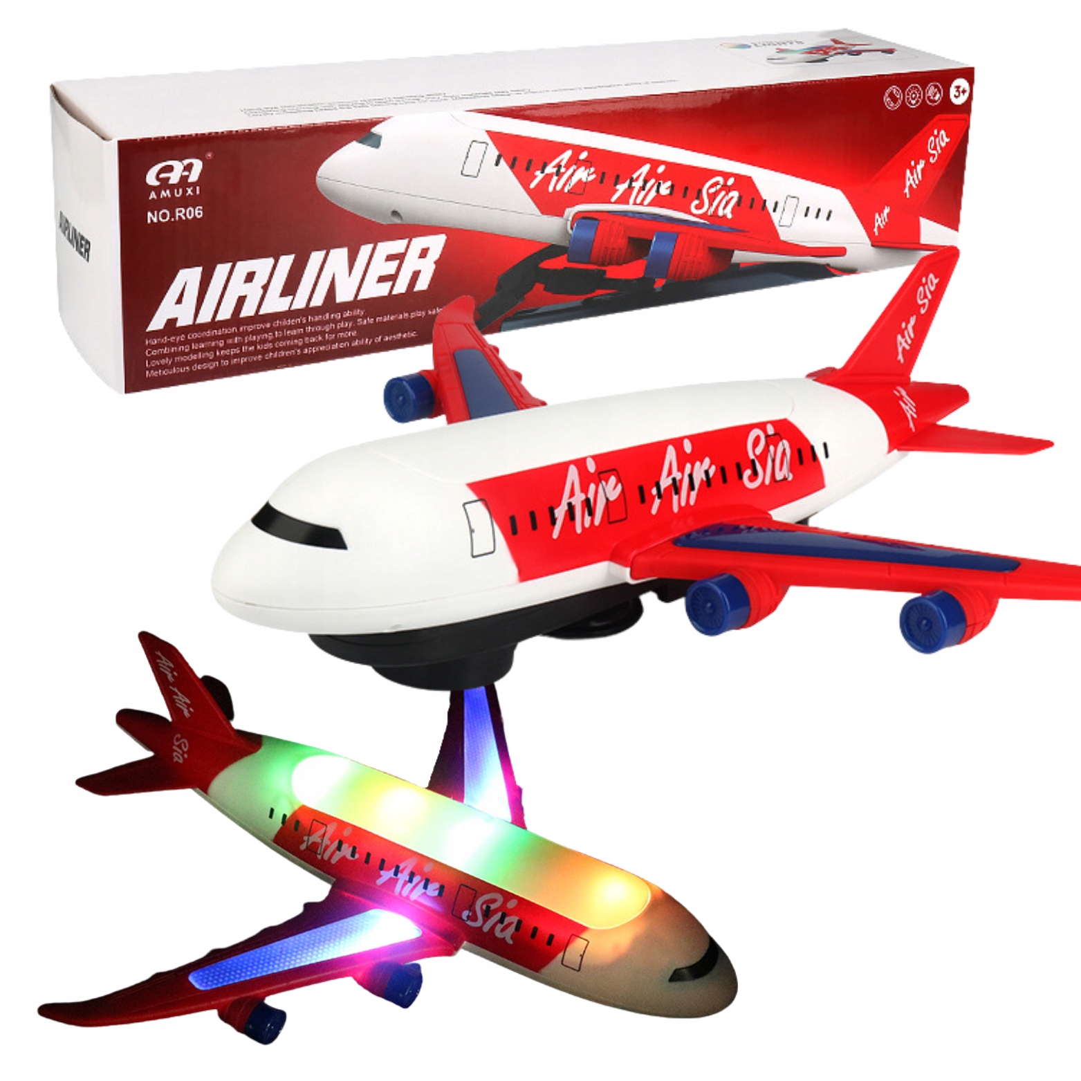 Модель літака має рухливий корпус, що означає, що літак може рухатися по плоскій поверхні. Дитина може уявляти злети та посадки та керувати рухом літака.