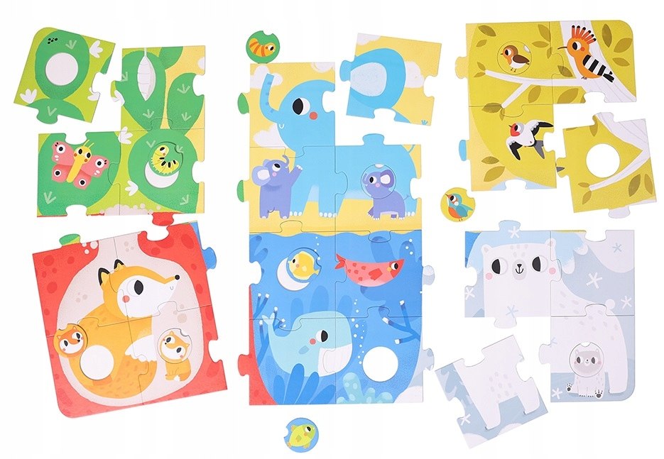 Веселі тварини з усього світу запрошують вас пограти разом! Розвиваючий пазл на підлогу представляє милих мешканців різних середовищ . Він складається з 34 елементів: 24 традиційних елементів головоломки та 10 знімних кілець, які потрібно встановити в отвори. Це чудова ідея для першої багатоелементної головоломки для дітей.