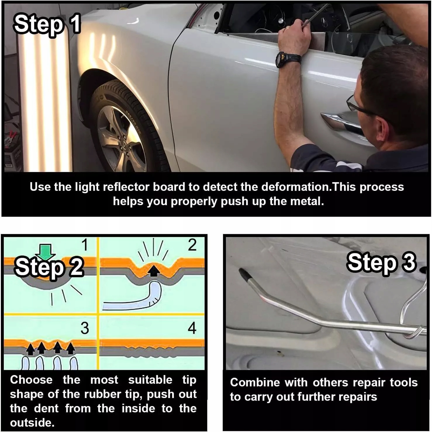 виготовлені з високоякісних матеріалів, міцних і стійких до корозій. Будь -хто може видалити вм'ятини, прості у використанні. Він може бути демонтований на двох різних T стрижнях, довгій T палиці для видалення вм'ятин та короткої T смуги для видалення вм'ятин, два інтелектуальні способи використання