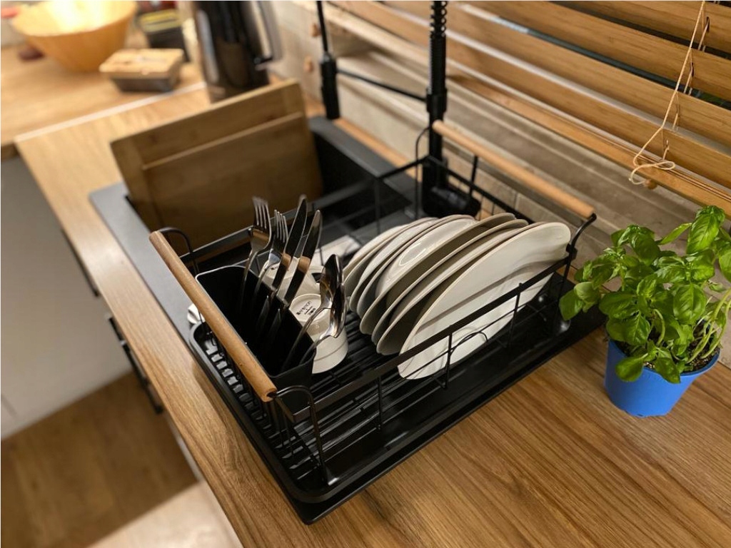 ✅Пофарбована в чорний колір металева рама та дерев’яні ручки чудово виглядатимуть на вашій кухні. Заокруглені та гладкі краї роблять продукт Brunbeste безпечним та простим у використанні. Вся металева конструкція пофарбована порошковою фарбою в єдиний колір - чорний. Чудово виглядає на кухні і ідеально виконує свої функції. Посуд швидко висихає на сушці, а завдяки подушечці, яка збирає воду і зливу на ній, ви можете поставити його прямо біля раковини. .