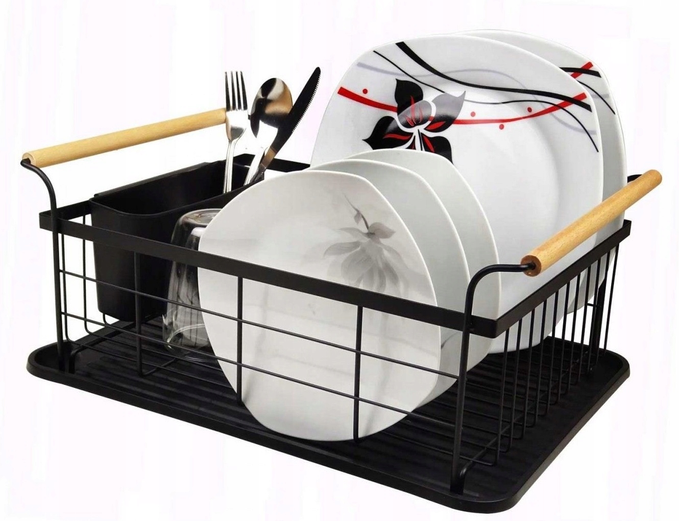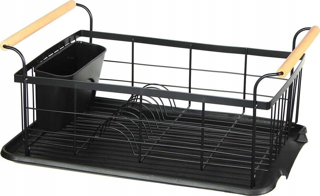 Сушка для посуду характеризується дуже високою якістю та міцною та металевою конструкцією. Смоляний піддон захищає стільницю від намокання. У комплект також входить пластикова двокамерна сушарка для столових приборів. Металева чорна підставка для сушарки з дерев’яними ручками – елегантне рішення для будь-якої кухні.