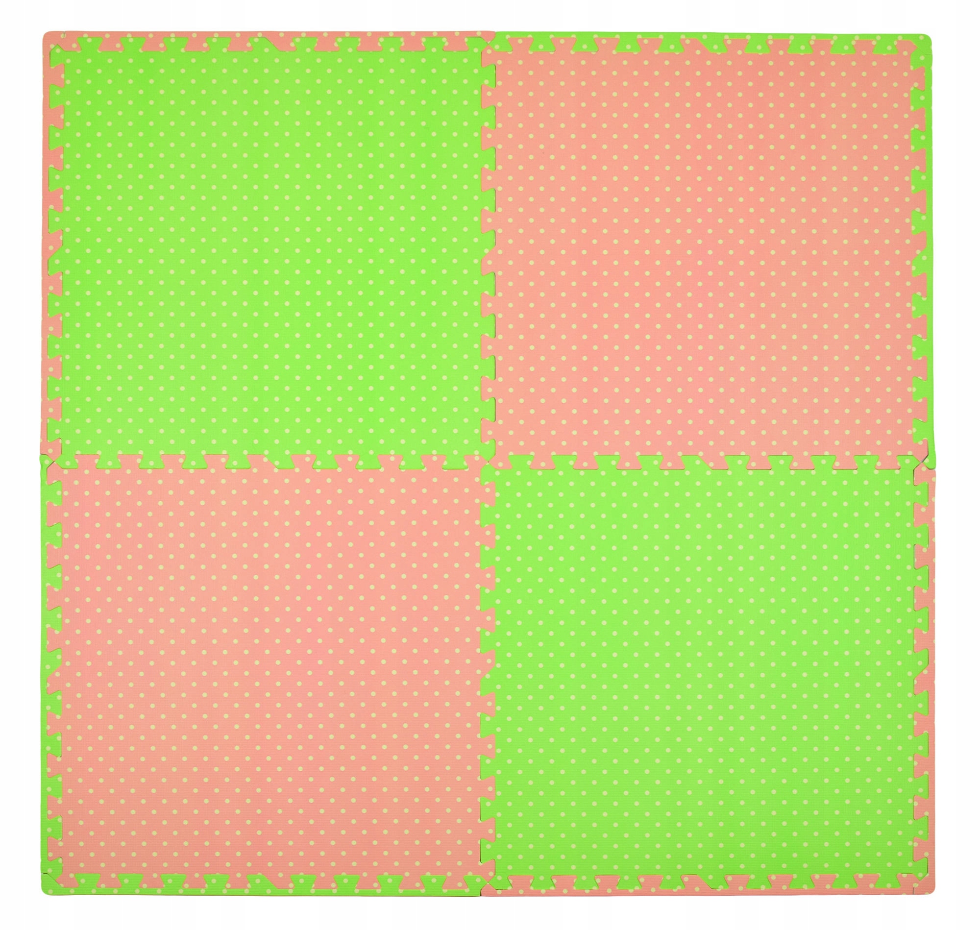 Набір складається з 4 пазлів двох кольорів - світло-рожевого та зеленого, прикрашених візерунком з білими крапками. Пазли мають малюнок проти ковзання внизу та тонку текстуру зверху. Вони мають вирізи по краях, щоб з’єднати їх разом, а також набір містить 8 прямих країв для обробки. Одна головоломка з кінцем має 62 см в ширину та довжину та 1 см в товщину.
