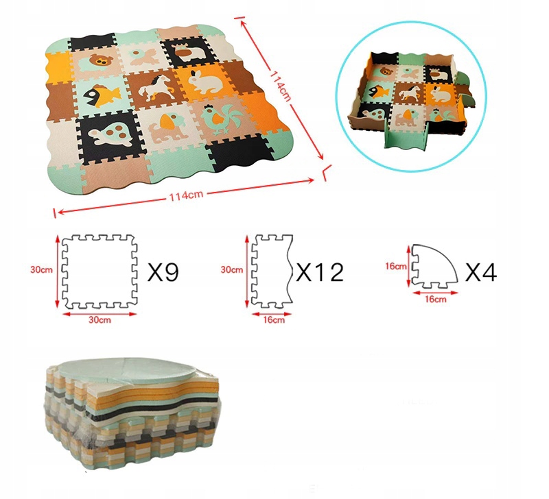Виріб виготовлено з м'якої піни EVA, яка чудово ізолює від твердої та холодної підлоги. Дитина, яка грає на килимку, захищена від падіння на тверду поверхню та холоду від землі. Килимок має теплові властивості. Килимки можна поєднувати один з одним, створюючи килимок ще більшого розміру.