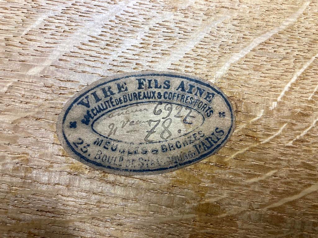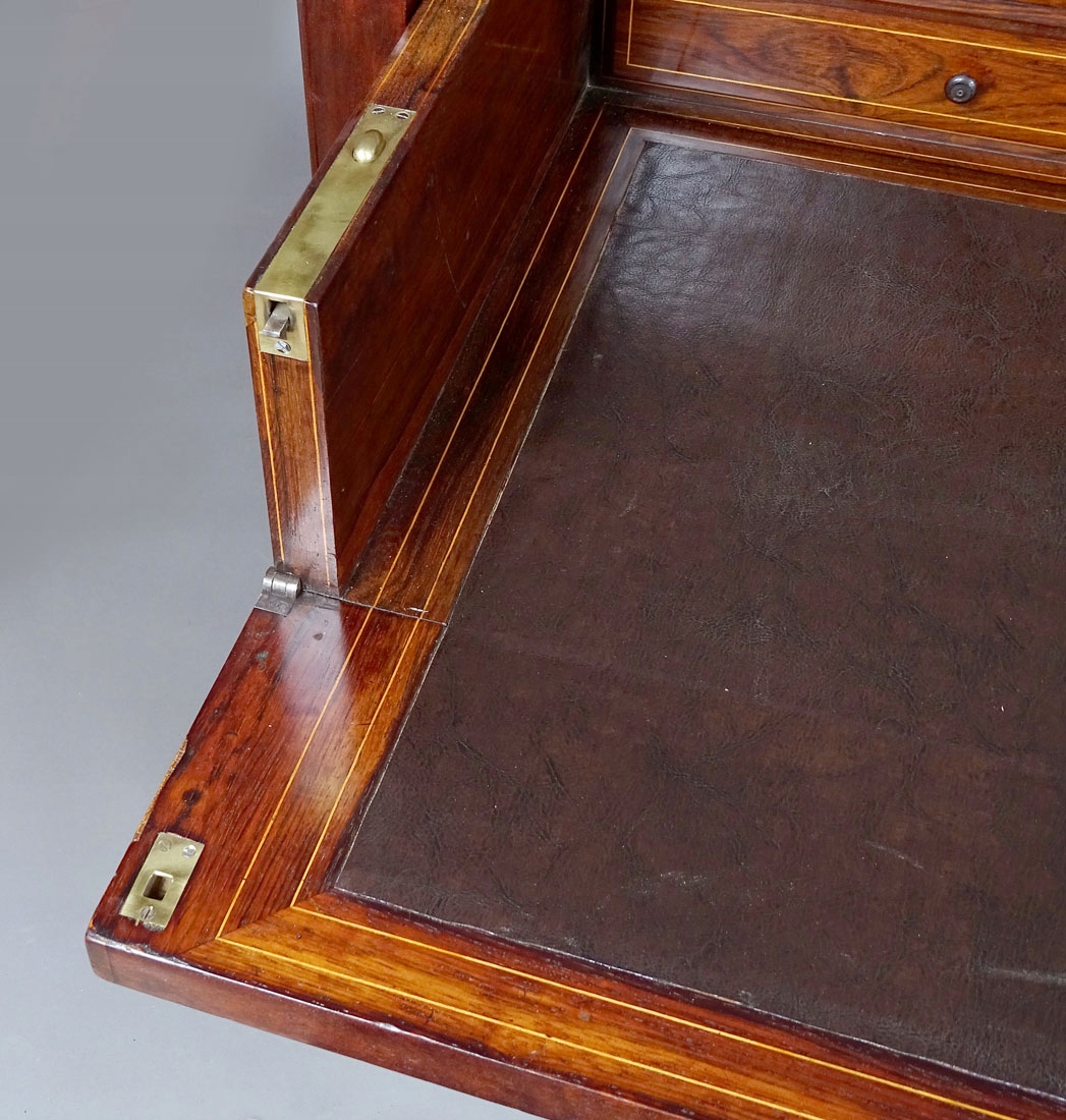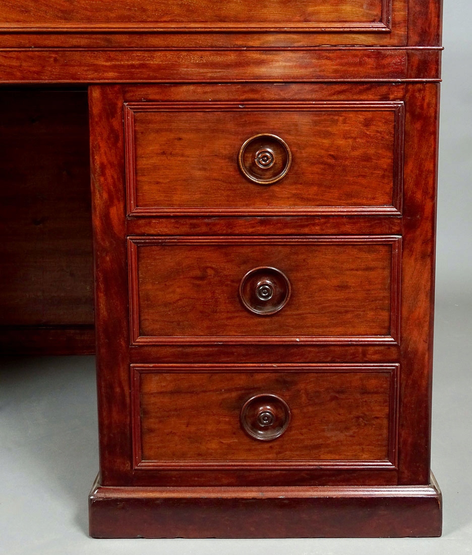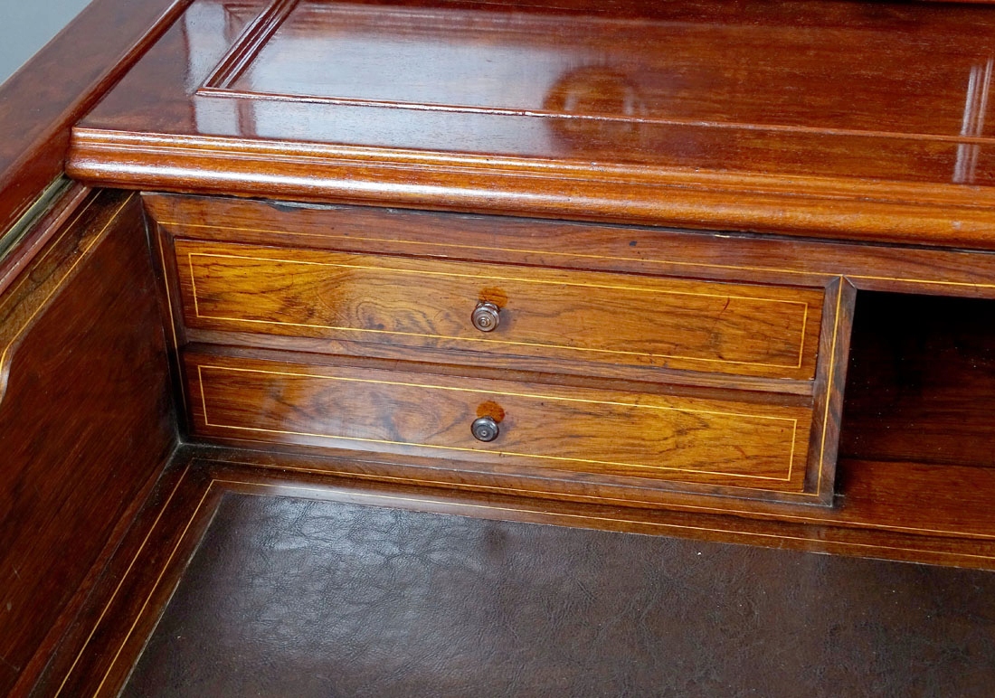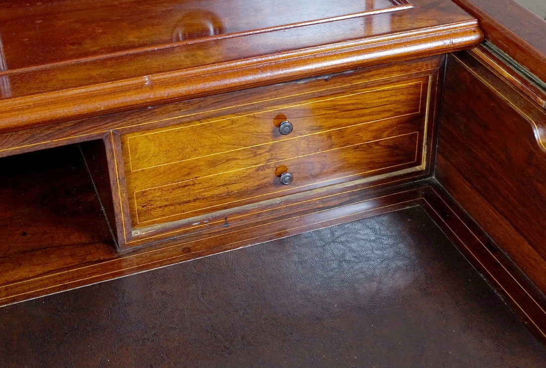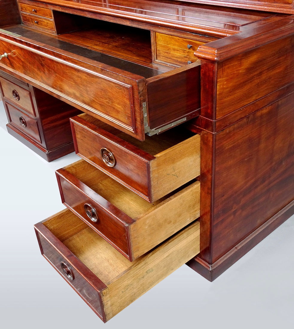 З прямими лініями рами спереду та з боків, з висувною та висувною верхньою частиною, з низька надставка, спирається на два ящики з трьома ящиками з боків, з широкими планками внизу. Під висувною та висувною верхньою шухлядою, що закривається на подвійний замок, є верхня частина, обшита шкірою, а також дві менші шухляди зліва та одна більша справа, з додатковим місцем для документів посередині. Кожна із зовнішніх шухляд оточена тонкою смугою та має точену ручку посередині, менші шухляди мають маленькі шухляди. У верхньому великому ящику зліва є додаткове відділення для зберігання, що замикається. Закривається все на один замок з ключем у стулці, після чого відмикаються решта ящиків, у тому числі в надбудові. У конструкції меблів є сталеві засувки та замки, що дозволяють відкривати ящики, механізм функціональний. Задня частина меблів також шпонована, штампи та записи на звороті шухляд.