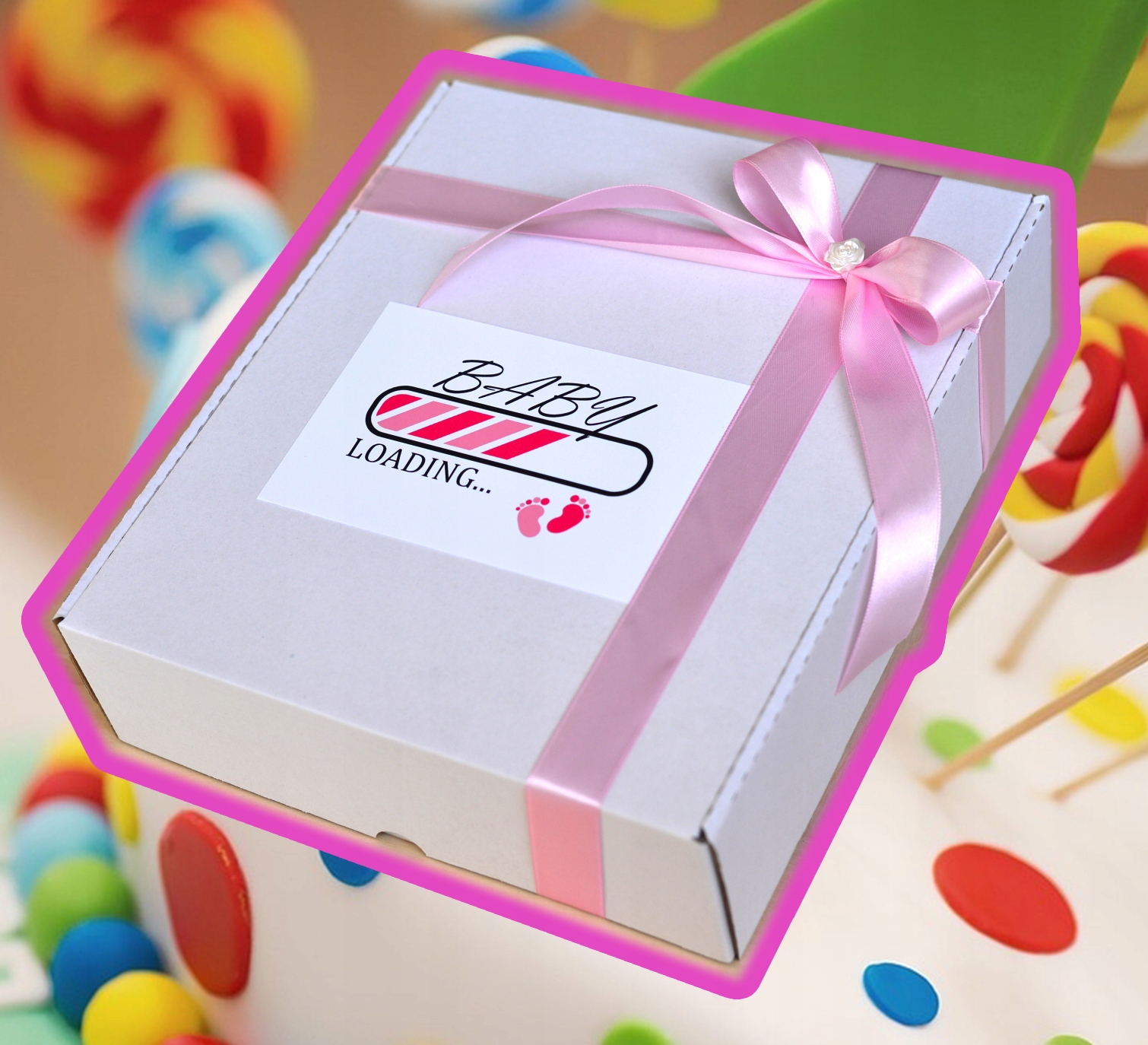 - Приємні побажання для майбутньої мами, які видно на кришці коробки.