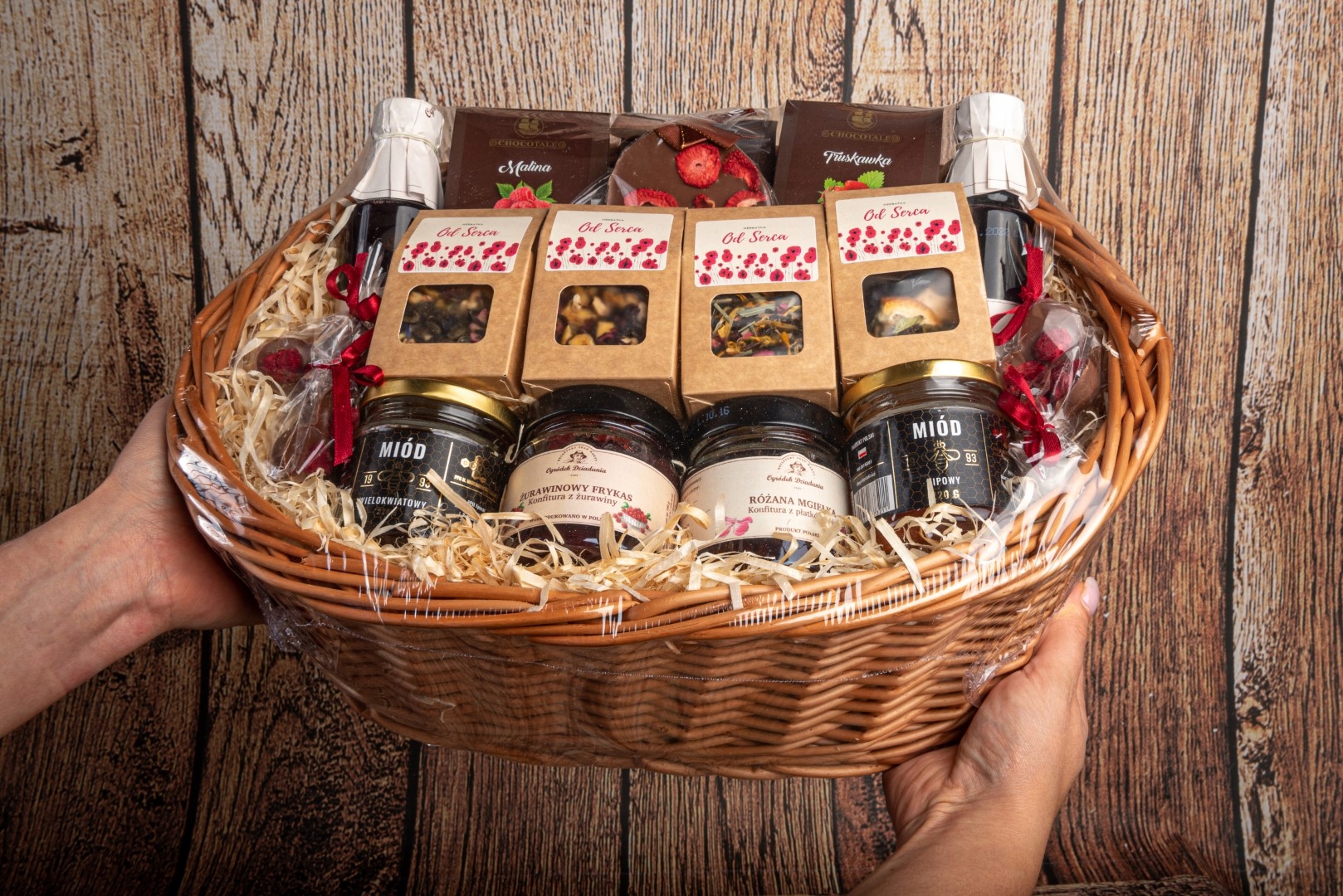 - Після вибору цієї опції вміст буде запаковано у коричневий плетений кошик із дерев’яним наповнювачем, але без ручки.