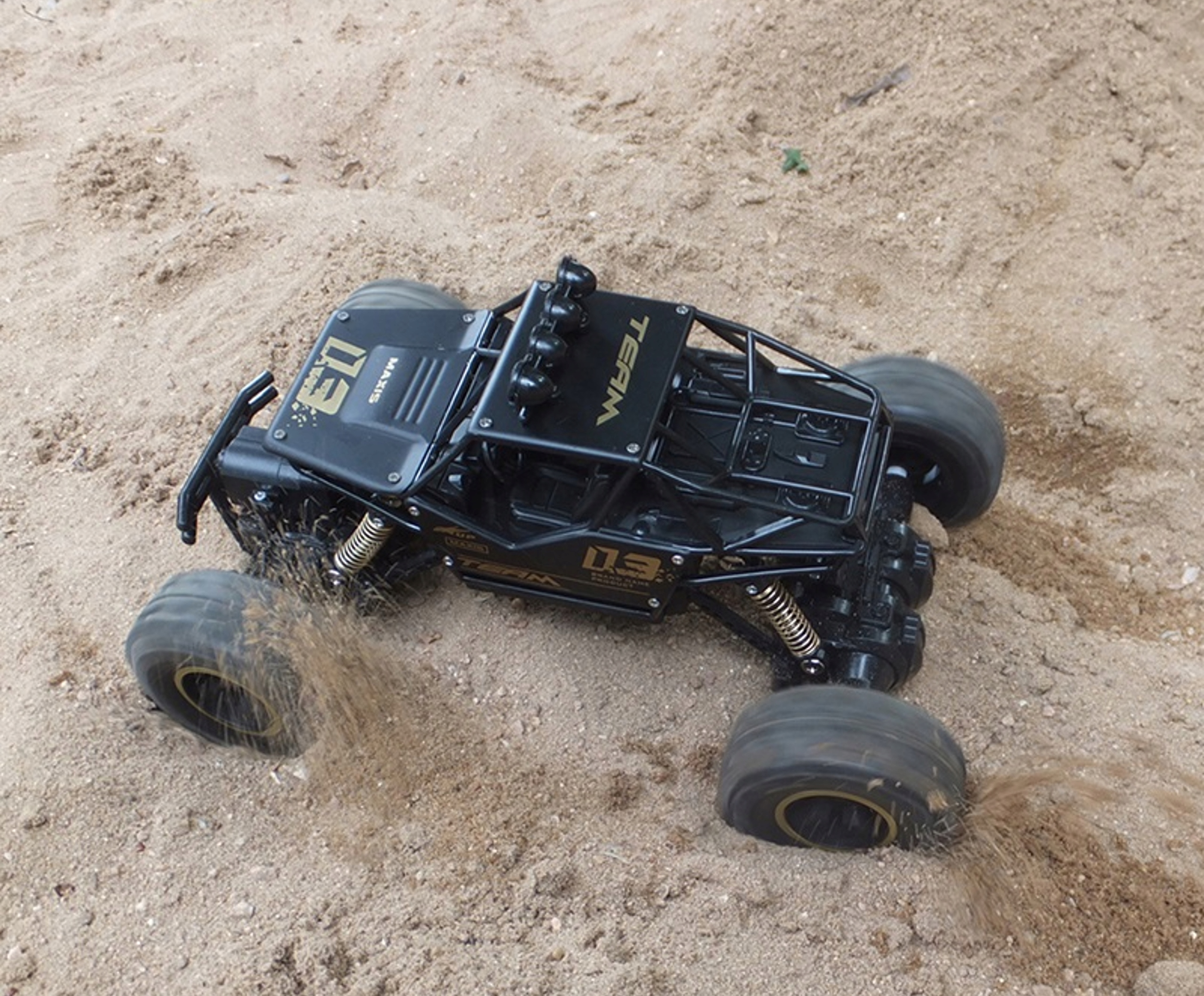 ➔М'які колеса та спеціальна підвіска, а також високе шасі дозволяють машині підніматися під кутом 45 градусів на нерівній місцевості. Він успішно долає круті підйоми та спуски, стрибає, справляється з багатьма перешкодами, даруючи масу задоволення та розваги як дітям, так і дорослим.