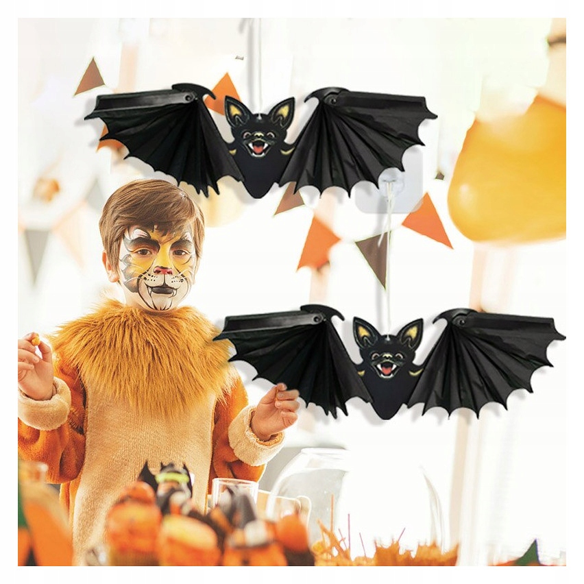 Поєднайте привабливий зовнішній вигляд із надзвичайно простою збіркою. Двосторонні паперові підвіски кажан, закріплені на шнурку, можна легко повісити на вибране вами місце. Характерні для Хелловіну прикраси з паперу, що висять над головами гостей, вони неодмінно помітять. І таким чином ви збільшите атмосферу всередині і додасте простору темну атмосферу. Декорації чудово підійдуть для вечірок як для дітей, так і для дорослих.