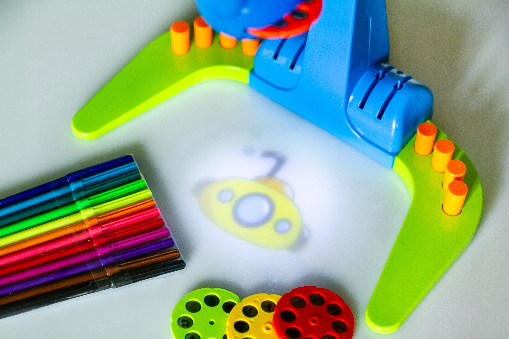 Набір містить чотири диски, які потрібно помістити в отвір у верхній частині проектора. Після ввімкнення спеціального підсвічування на папері з’явиться вибраний малюнок, який потрібно нанести. Щоб перейти до наступного зображення, просто перемістіть диск на одну точку праворуч або ліворуч. Ретельна робота та кольорові маркери надихають на задоволення.