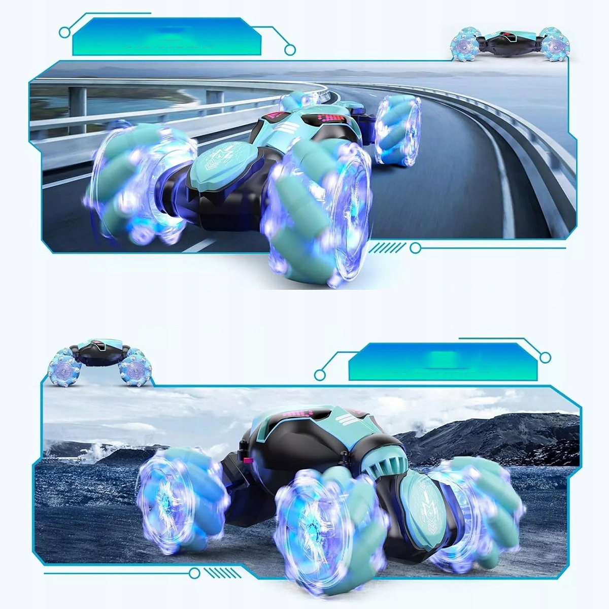 【Подвійний режим дороги та поза дорогою】 Унікальна структура біонічного хребта дозволяє цьому трюковому автомобілі безкоштовно перемикатися між режимом дороги та поза дорогою в різних важких умовах місцевості, забезпечуючи ідеальне враження від гонок на свіжому повітрі. Автомобіль з віддаленим керуванням сумісний з різними ділянками, такими як луки, піщані райони, каламутні райони, гірські дороги та сніг.