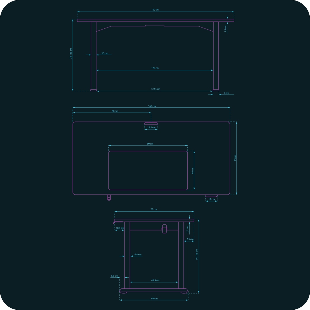 Електричне регулювання висоти у великому діапазоні від 74 до 116 см дозволяє використовувати стіл. стоячи, а завдяки роботі від двох двигунів і просторій поверхні стіл може легко вмістити і переносити велику кількість обладнання. Подвійні опори та додаткові зміцнення забезпечують збереження структурної стабільності столу.
