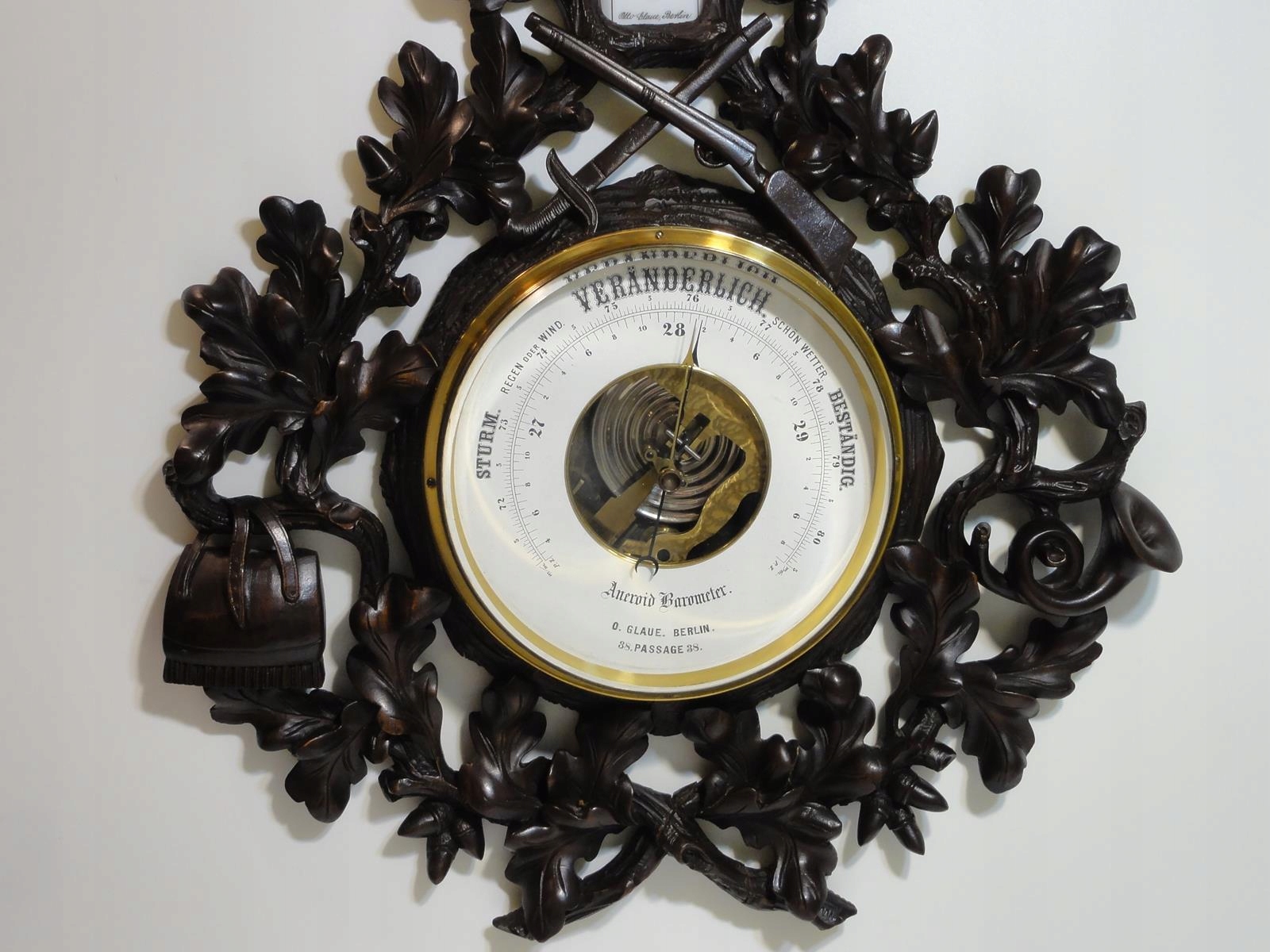 ВЕЛИКИЙ РІЗЬБЛЕНИЙ БАРОМЕТР З ТЕРМОМЕТРОМ -АНЕРОЇДНИЙ БАРОМЕТР O. GLAUE BERLIN