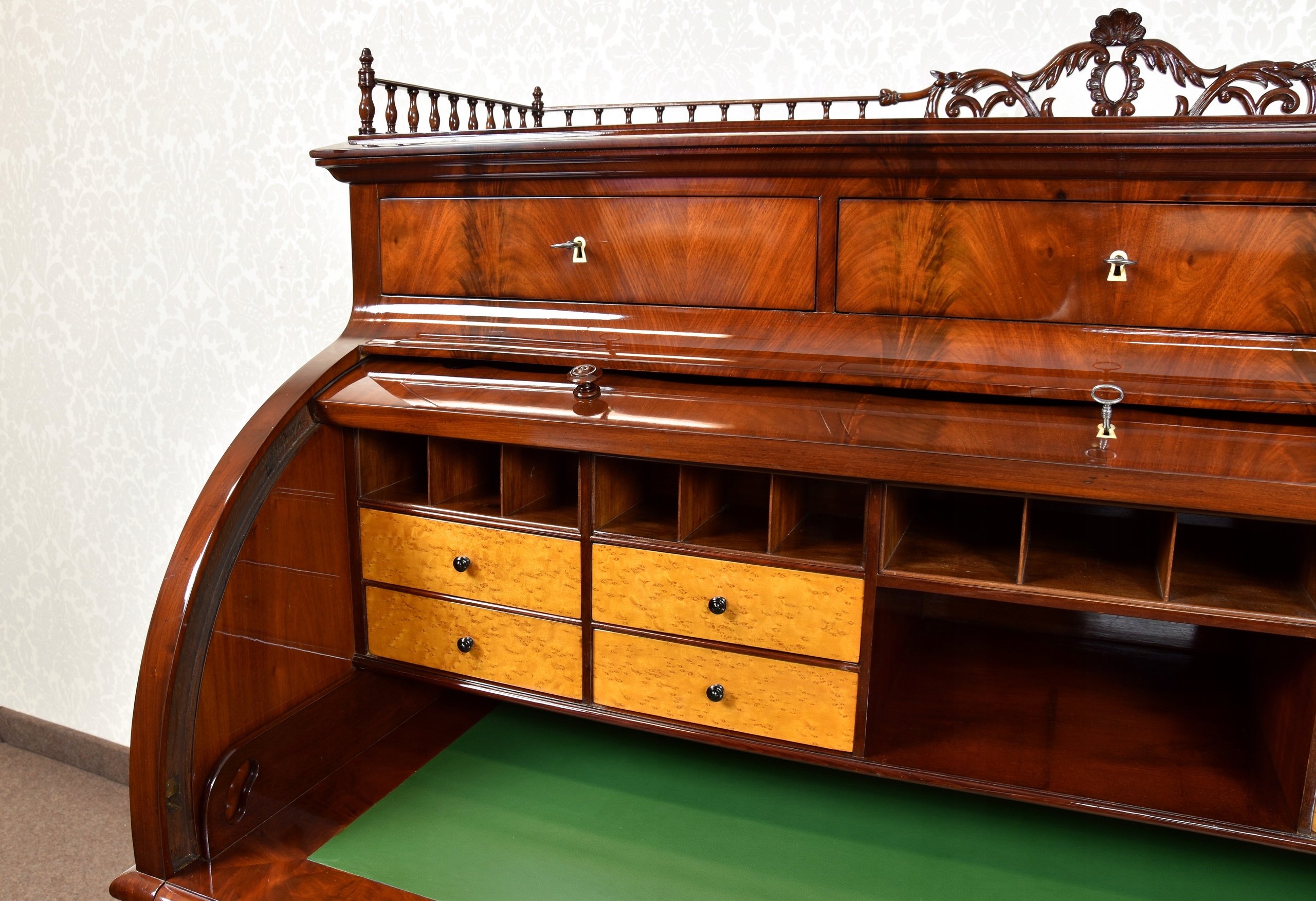 Стіл пройшов ретельний професійний ремонт і знаходиться в ідеальному стані як технічно, так і візуально. Дерево в дуже хорошому стані. Конструкція дуже жорстка і стійка. Замки та фурнітура повністю справні, в комплект входить одинадцять ключів. Додаткова висувна верхня частина обшита новою зеленою натуральною шкірою.