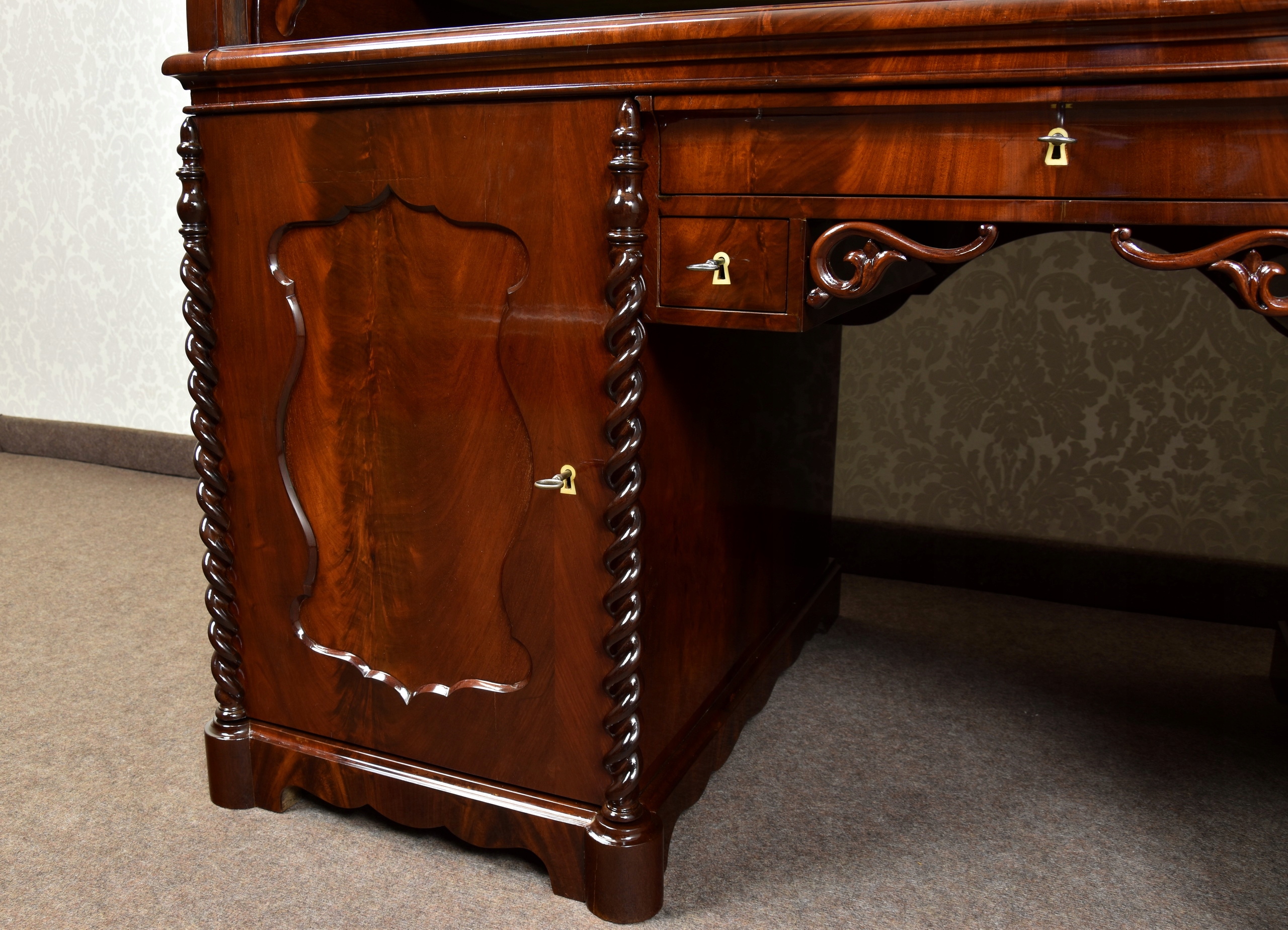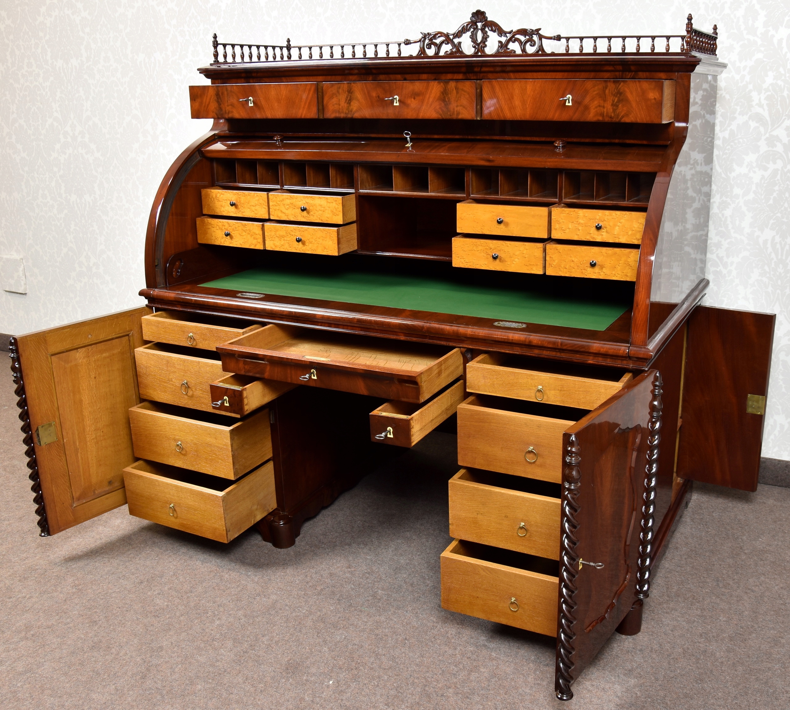 Письмовий стіл виготовлено шляхом облицювання пірамідальним червоним деревом на структурі дубового дерева. Усі ящики виготовлені з масиву дуба, а невеликі відділення для документів виготовлені з червоного дерева. Для обшивки яскравих шухляд використали так званий клен. Павине око. Меблі оброблені шелаковим лаком, нанесеним і натертим вручну ватною подушечкою до високого блиску. Збережені доремонтні кольори, які чудово підкреслюють текстуру дерева.
