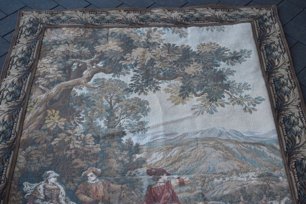 На наступному аукціоні я пропоную вам цінні, незвичні, виготовлені з високої якості декоративної тканини, підписаної Гобеліну/Тапізерії, що зображує мотив полювання. /b>