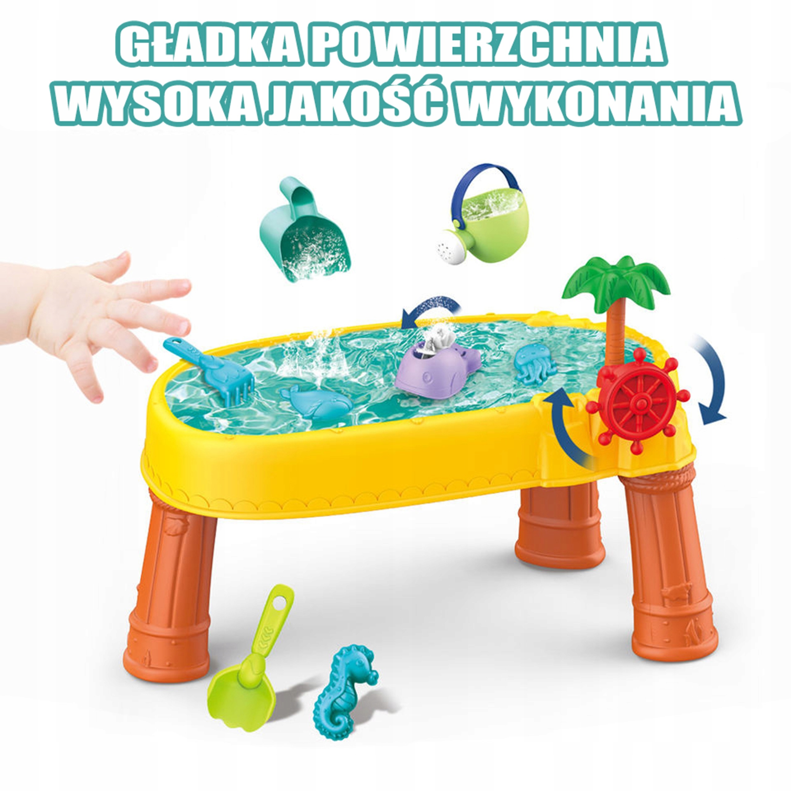 Sand Table від бренду WOOPIE - ідеальна іграшка для гри з водою і пісок. У набір 8 аксесуарів: 3 формочки, рибка, лійка, ємність з ручкою і лопатка. У столика є кермо, яке можна повертати і відчувати себе справжнім піратом. Набір призначений для гри в приміщенні та на вулиці. Ідеально підходить для гри вдома, на пляжі чи в пісочниці.