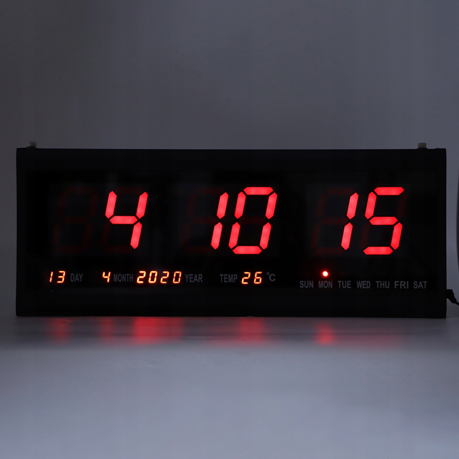 Цей великий яскраво-червоний цифровий світлодіодний годинник яскраво, чітко та легко читається! Час відображається за допомогою високоякісних червоних світлодіодних табличок відповідного кольору та яскравості. Він також показує день тижня, дату, температуру та вологість. Вся ця інформація відображається внизу. Його можна використовувати вдома або в комерційних, промислових і офісних середовищах, оскільки він має простий і елегантний дизайн. Живлення від адаптера змінного струму та батареї типу «таблетка» для резервного копіювання пам’яті.