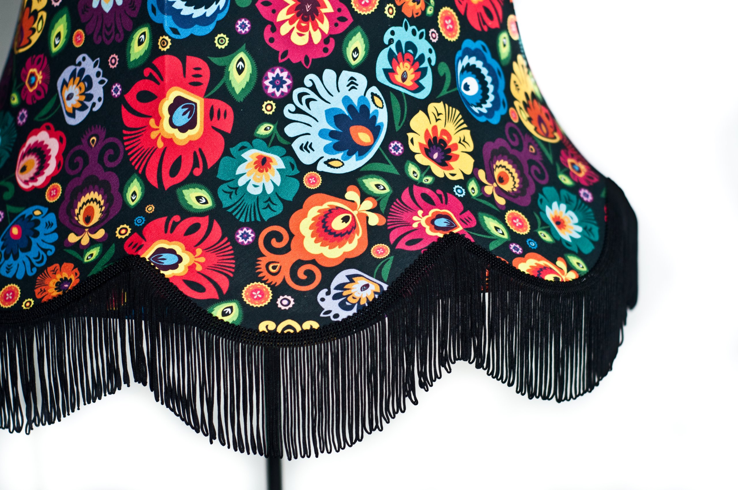 Лампшад з низьким стилем виготовлений з щільно плетеної бавовняної тканини , на якій розміщений цифровий друк - візерунок Lowicz. Це світильник для ламп для підлоги, ми можемо зробити це як підвісну світильник.