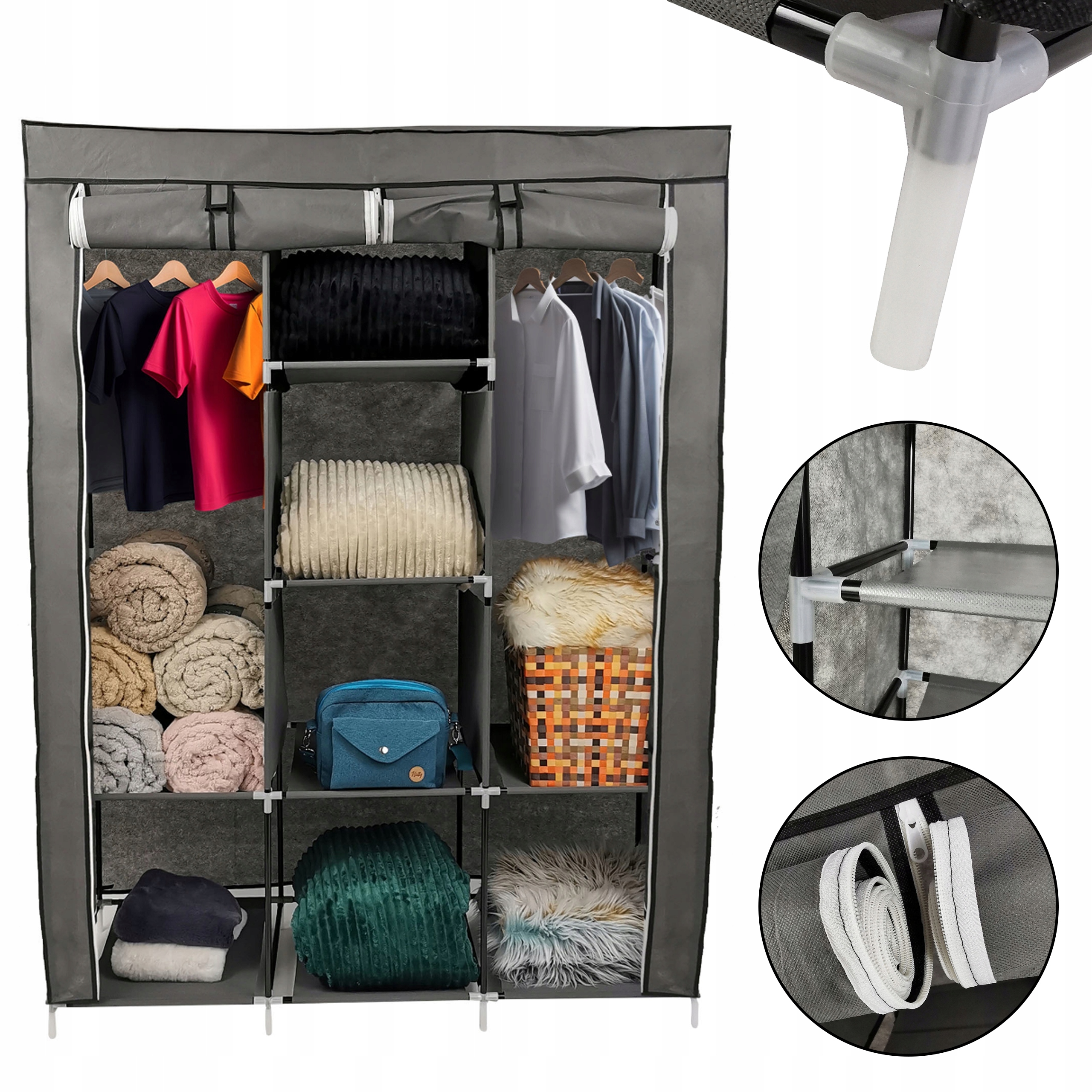 Дві дверні шторки, оснащені липучками та блискавками, ефективно захищають вміст від пилу та бруду. Решітка для одягу надійна та довговічна. Текстильна шафа виглядає стильно і підходить для різних приміщень, таких як спальня, коридор або гардеробна.