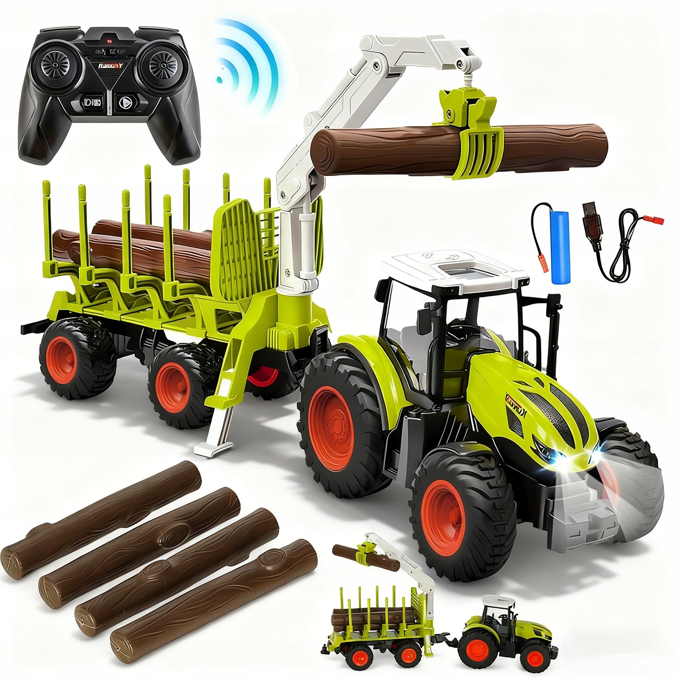 Набір, точно розроблений у масштабі 1:24, включає трактор з дистанційним керуванням, причіп із висувною підвіскою, 3 «стовбури дерев», акумулятори, пульт дистанційного керування, USB кабель для зарядки і викрутка. Готовий до гри прямо з коробки, без додаткових аксесуарів.