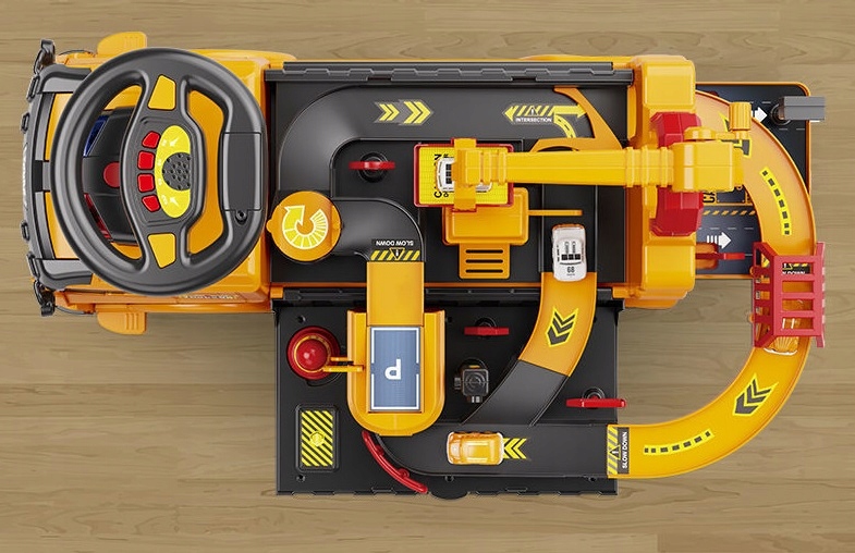 При відкритті екскаватор перетворюється на стоянку! Чотири менші автомобілі викочуються з салону на двох платформах. Також на великій платформі є кран для невеликих автомобілів.