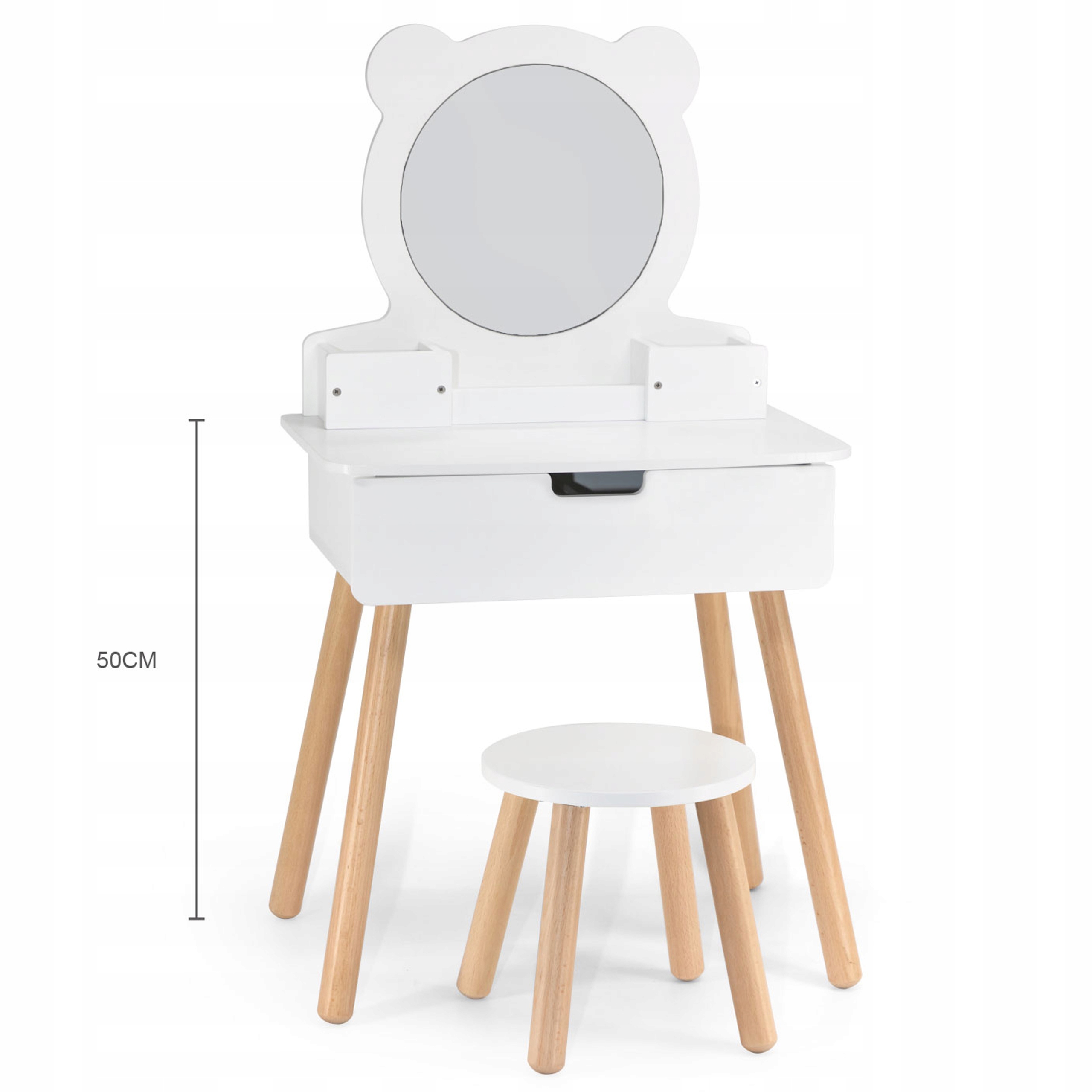 Великий окремо стоячий білий туалетний столик + набір аксесуарів у красивій сумці-єдинорізі від бренду Viga - набір мрії в кімнаті кожної дівчини. Туалетний столик має висувний ящик, в якому маленька принцеса може заховати свої скарби. Під самим дзеркалом є відділення для зручних аксесуарів. У комплект також входить туалетний стілець. У сумці-єдинорізі всі необхідні аксесуари, як із салону краси.
