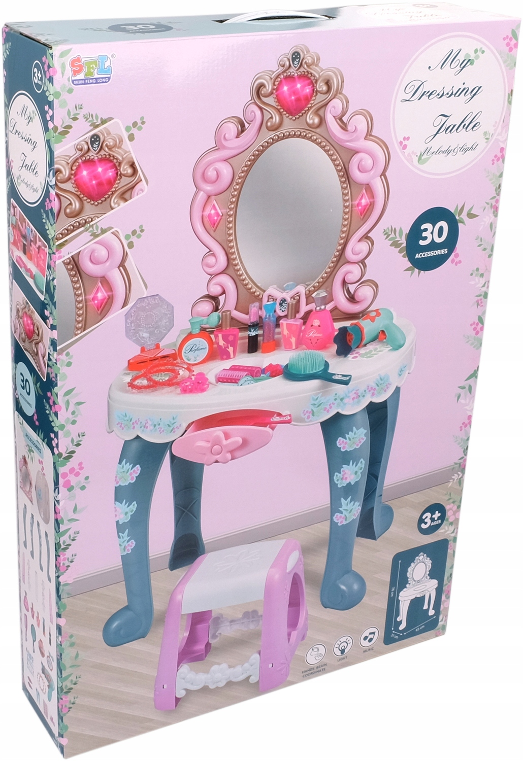 Юна дівчина знайде тут все, щоб підготуватися до великого балу чи вечірки з друзями. . У ньому є столик з полицями та дзеркалом, а також численні аксесуари, такі як імітації парфумів та прикраси. Ящик під дзеркалом - чудове місце для дівочих скарбів. Туалетний столик - чудова прикраса кімнати дівчинки і гарантія незабутнього веселощів. Надійне виготовлення та високоякісні матеріали забезпечать тривале задоволення.