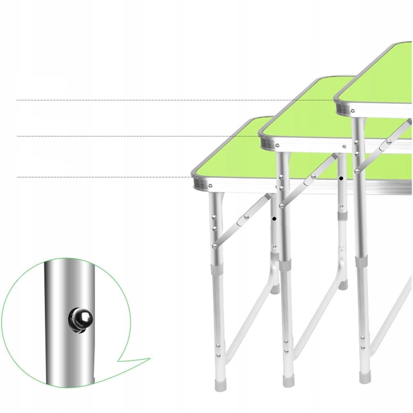 ✔️ Стійка конструкція - багато елементів сприяють стійкості набору. Після розкладання столу можна зафіксувати його ніжки та стільницюбез несподіваних рухів або ризику випадкового складання під впливом навантажень на стільницю. Ніжки оснащені спеціальною антиковзкою гумою, яка забезпечує статичність на слизьких поверхнях і не ковзає. Крім того, сама рама дуже довговічна завдяки своїй конструкції з алюмінію.