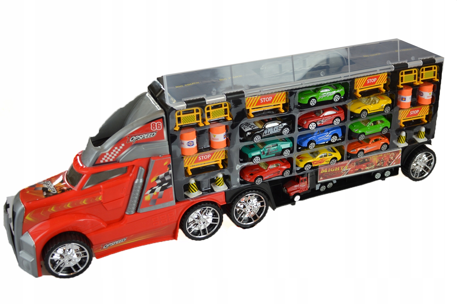 Усередині причепа ви знайдете 11 металевих пружин і 16 дорожніх аксесуарів. На даху вантажівки є спеціальний ковзок, по якому автомобілі ковзатимуть і падають через отвір у передній частині вантажівки!!