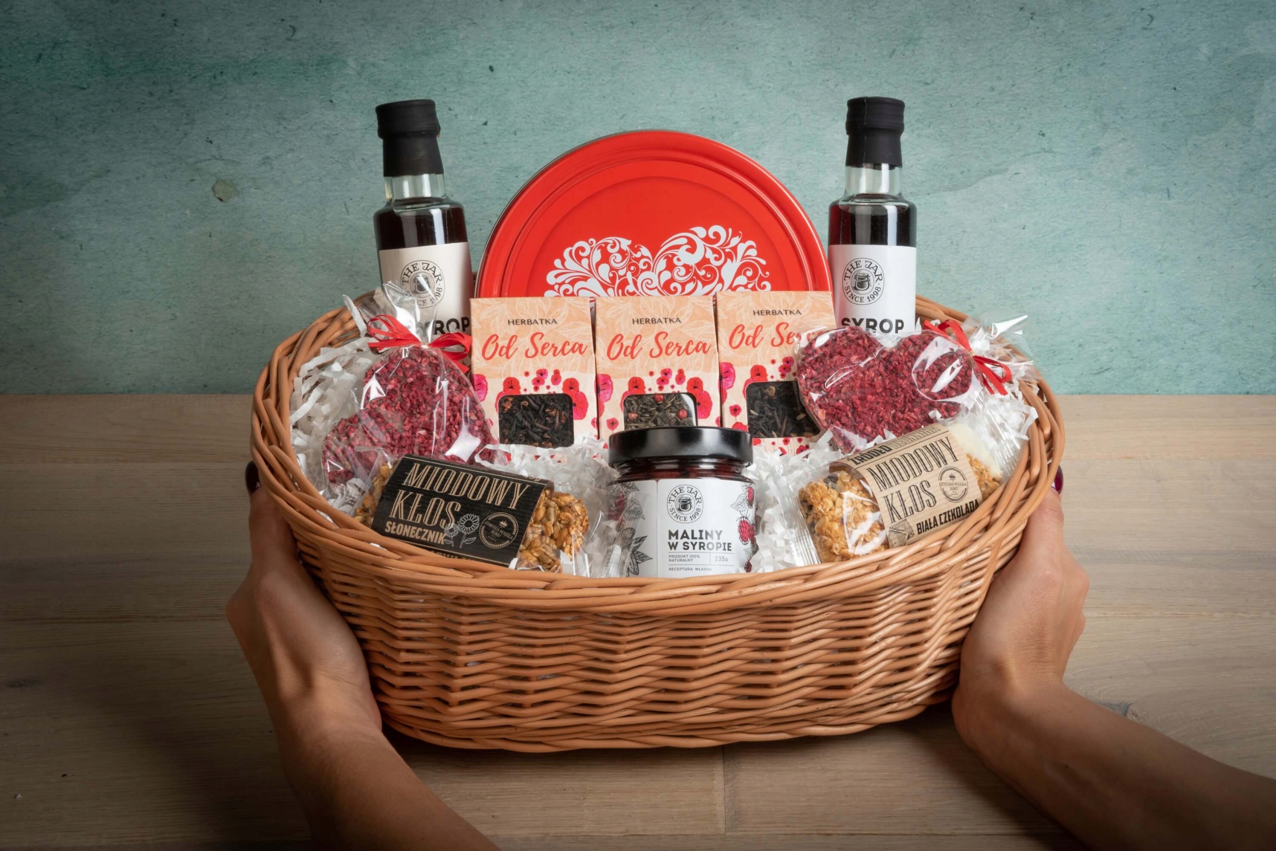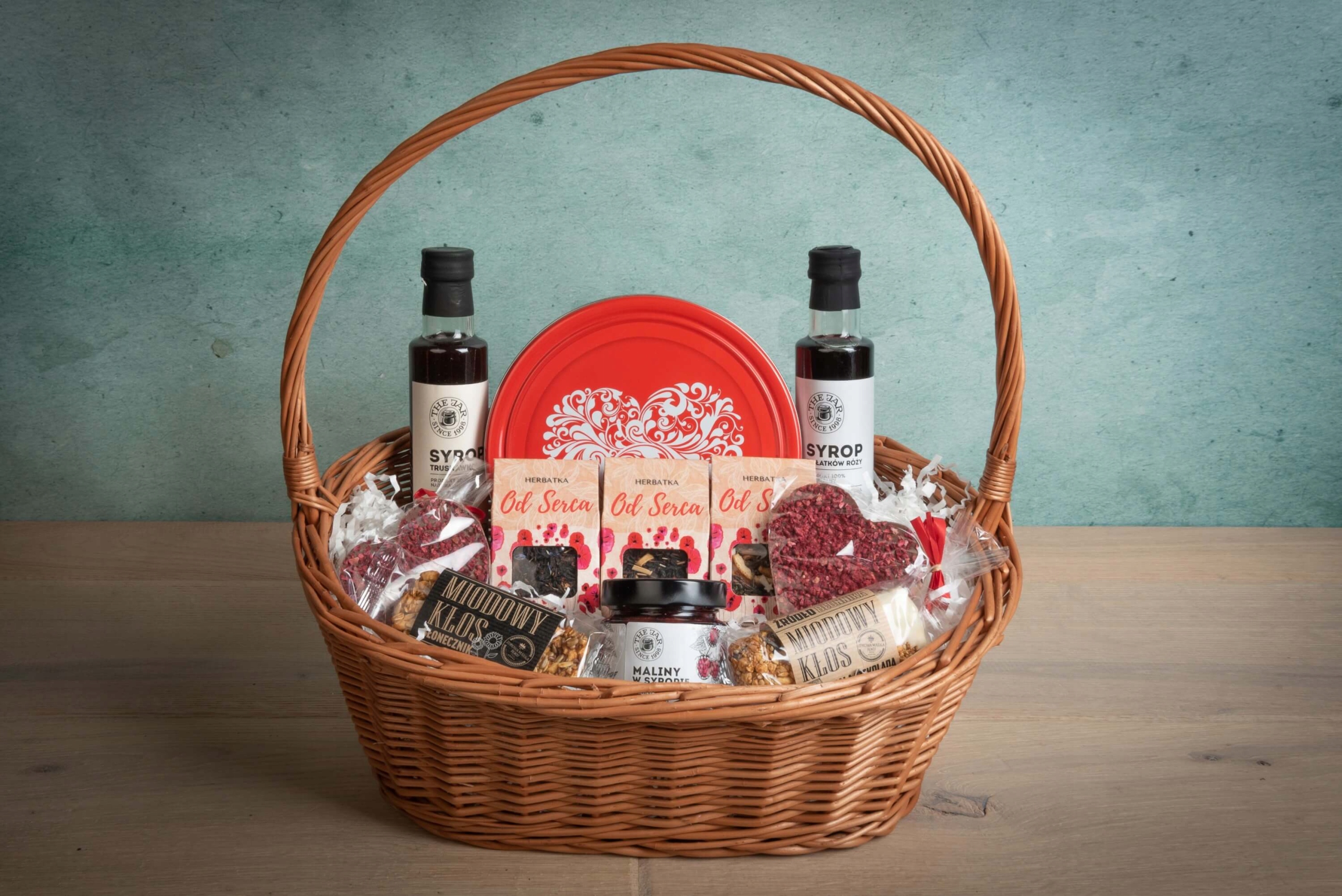 ВЕЛИКИЙ ВІД СЕРЦЯ Подарунковий кошик з печивом і шоколадним набором чайних сиропів