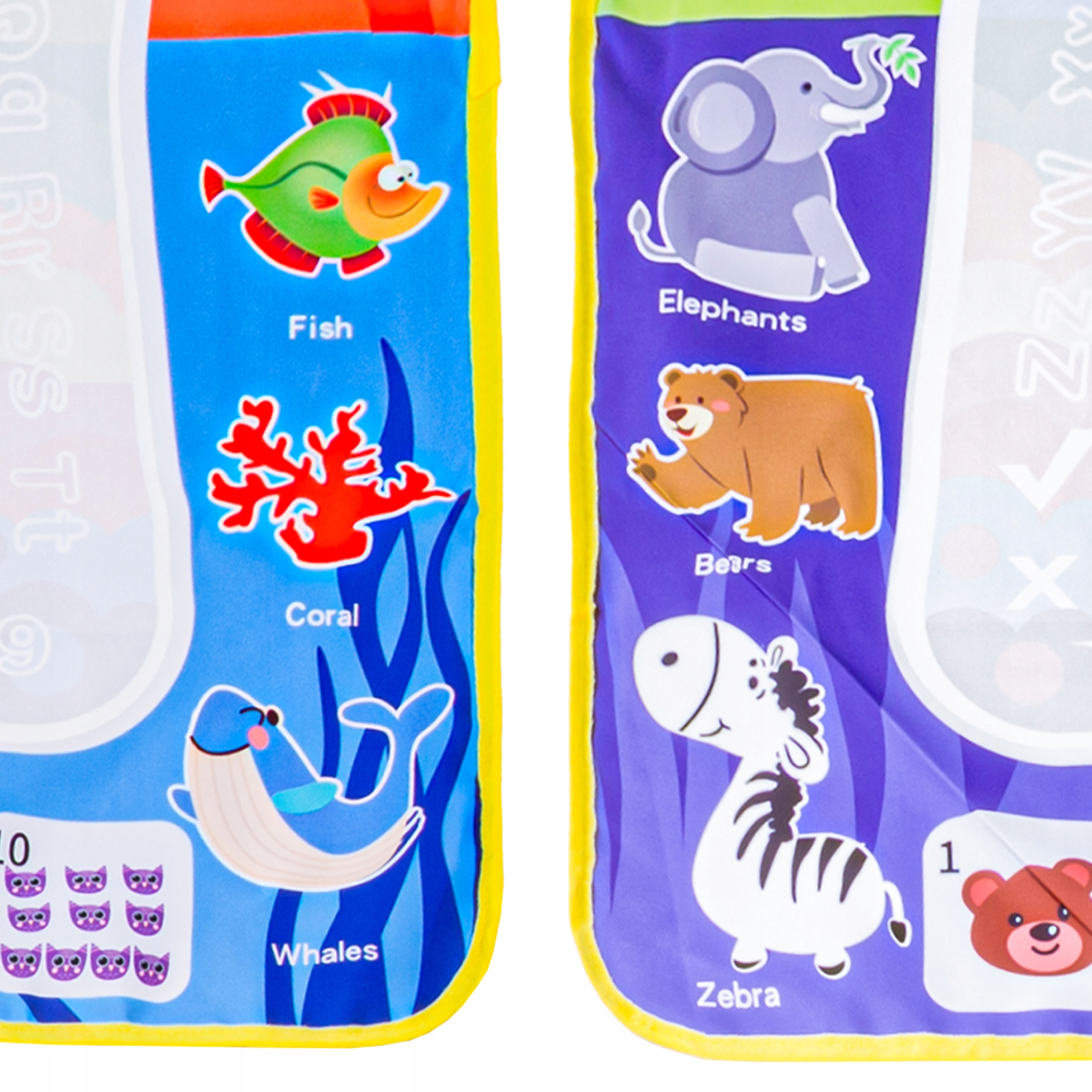 Його можна використовувати для вивчати кольори, тварин та їхні назви англійською мовою та для вивчення математики. У нижній частині килимка ви знайдете колекції, що містять тварин у номерах, що відповідають відповідним цифрам. На самому килимку також є приховані форми, геометричні фігури та літери алфавіту, які стануть видимими лише після фарбування водою. Дно килимка водонепроникне.