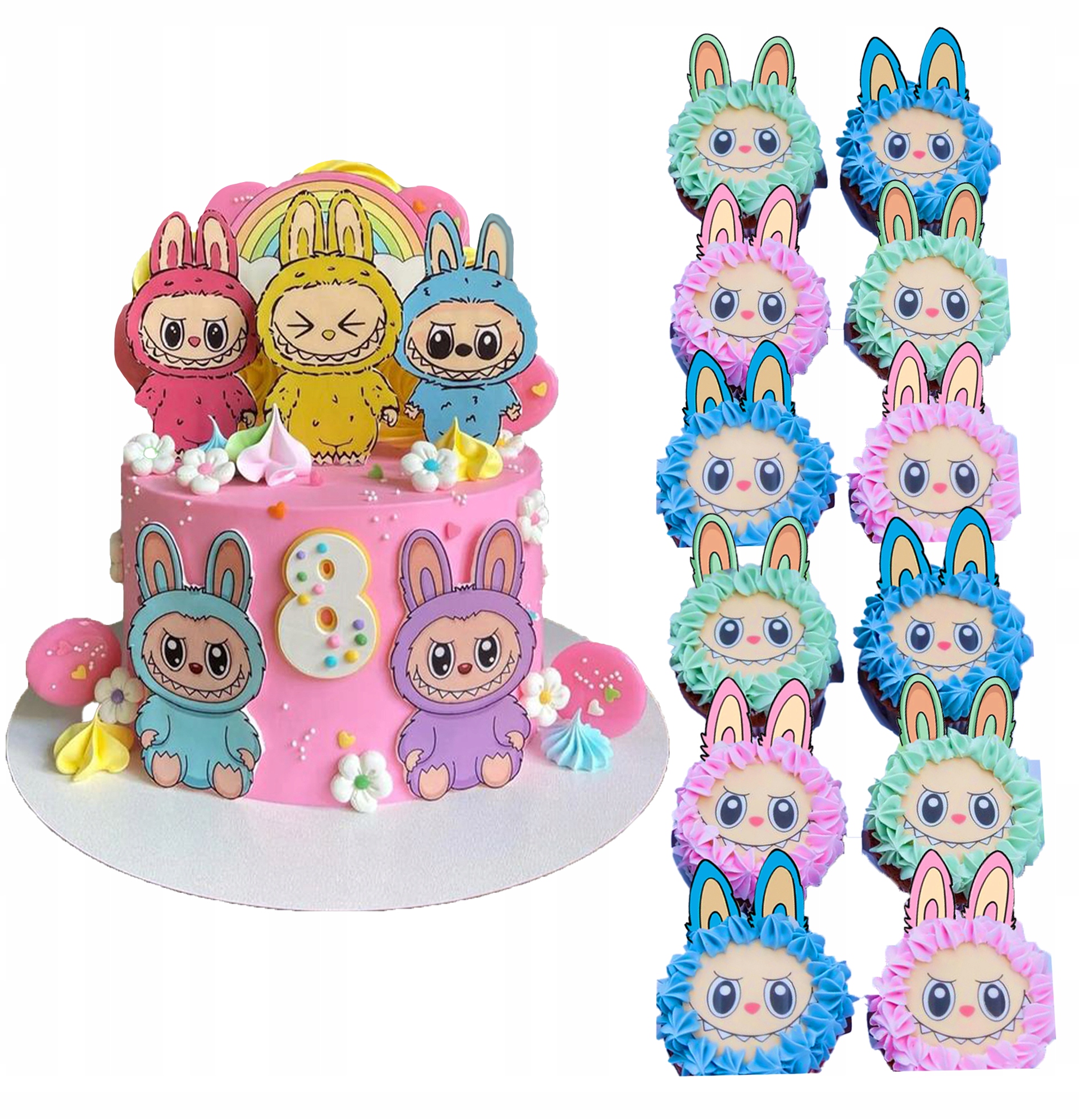 ВЕЛИКИЙ XXL НАБІР ДЕКОРАЦІЙ ДЛЯ ТОРТА 2D фігурки ЛАБУБУ + 12 топерів для капкейків