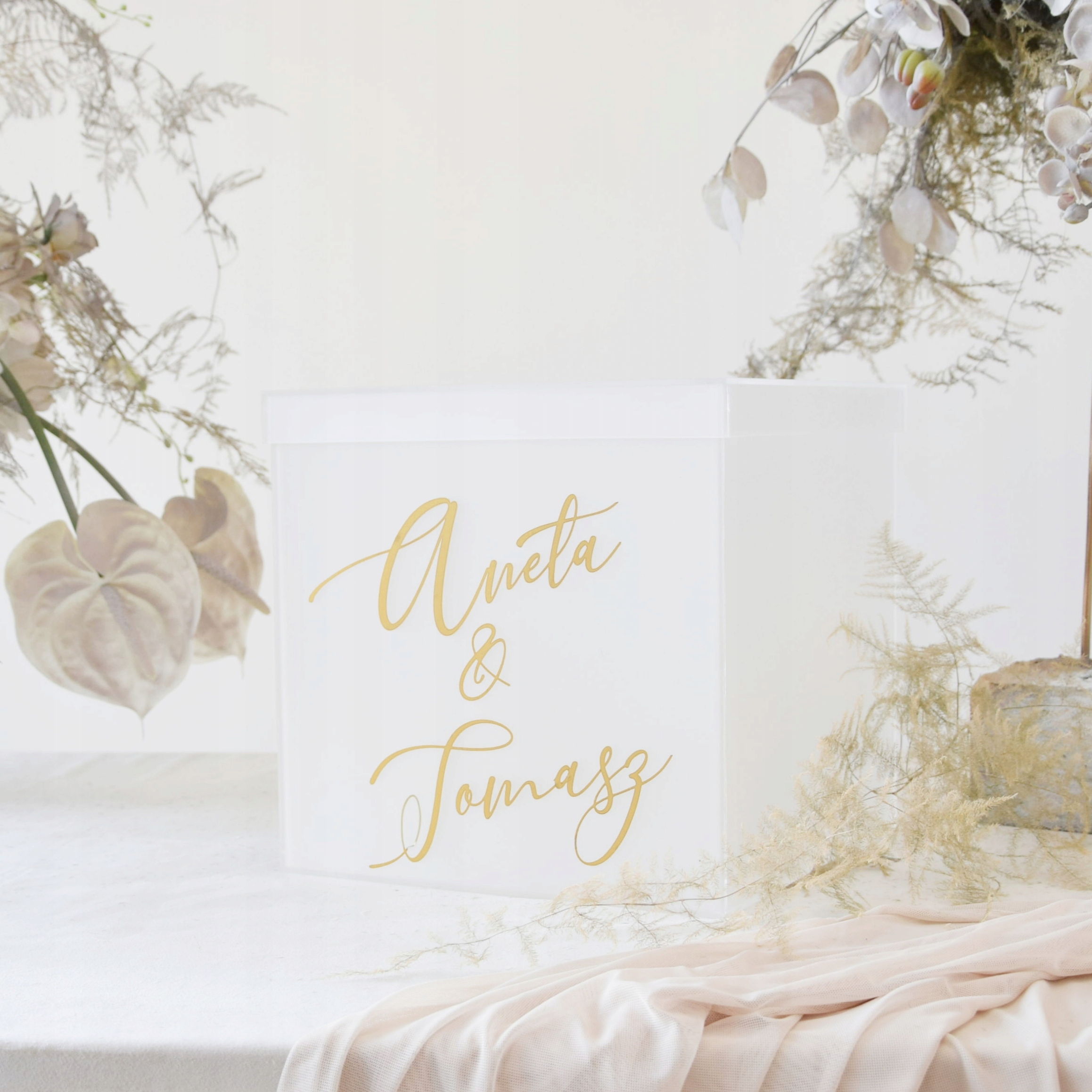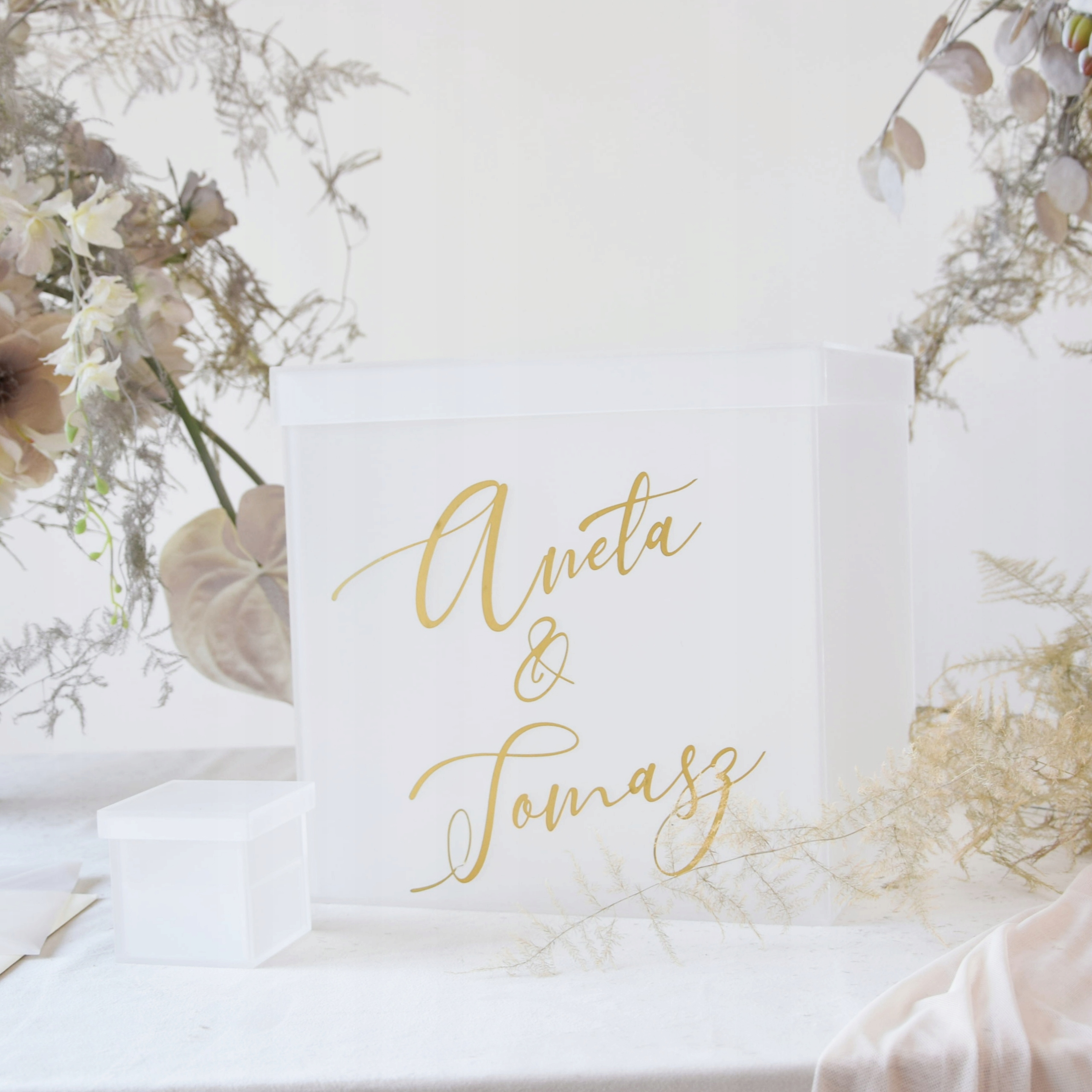 На нашому аукціоні ми пропонуємо гарну ексклюзивну коробку для конвертів і обручок з товстого матового оргскла з вашими іменами та ініціалами з нашої нової колекції «INSTANT SUMMER Memories»
