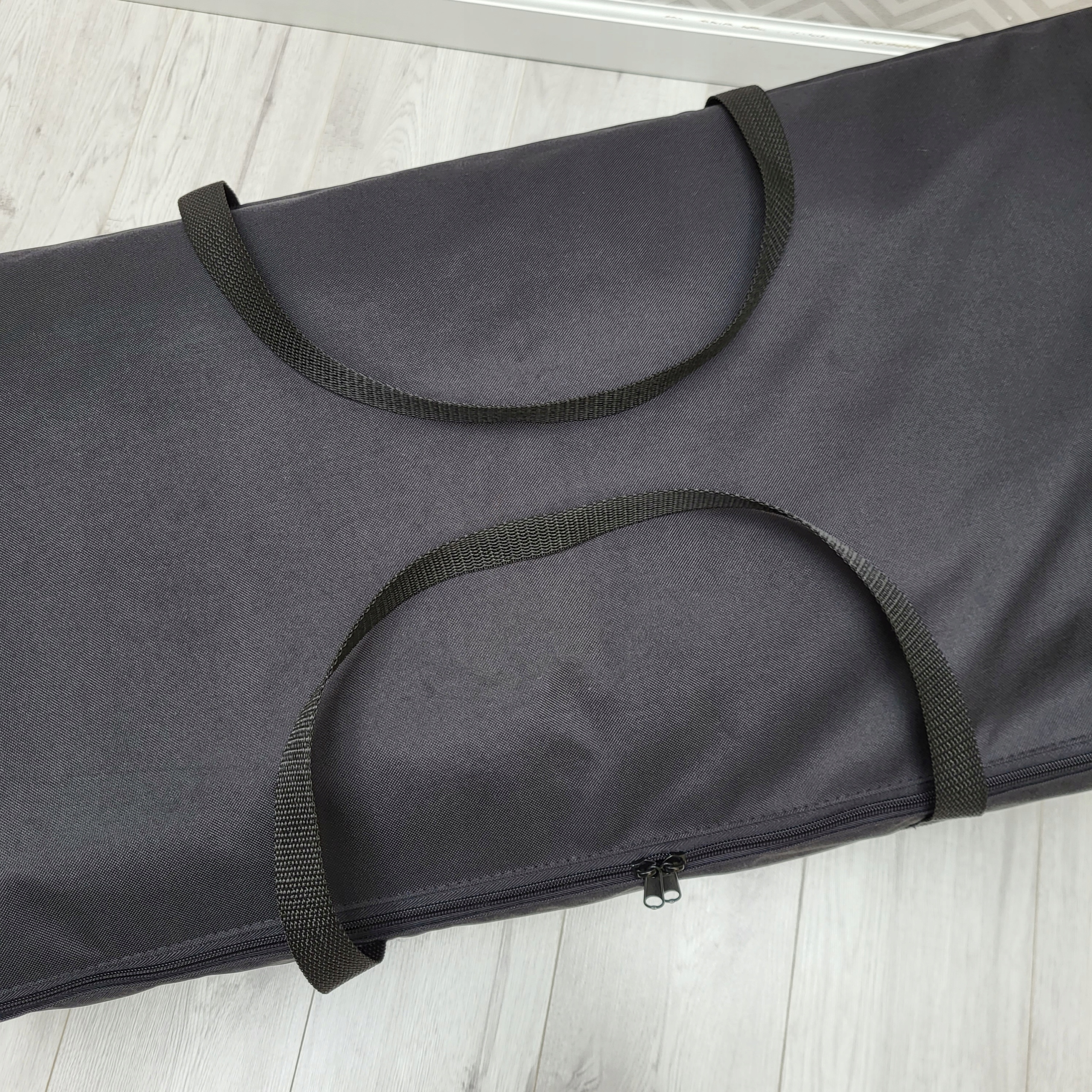 Чохол виготовлений з тканини коляски, яка є міцною та стійкою до механічних пошкоджень та погодних умов (водонепроникна). Сумка закривається на подвійну експрес-блискавку. Має міцний ремінь, який полегшує перенесення коляски.