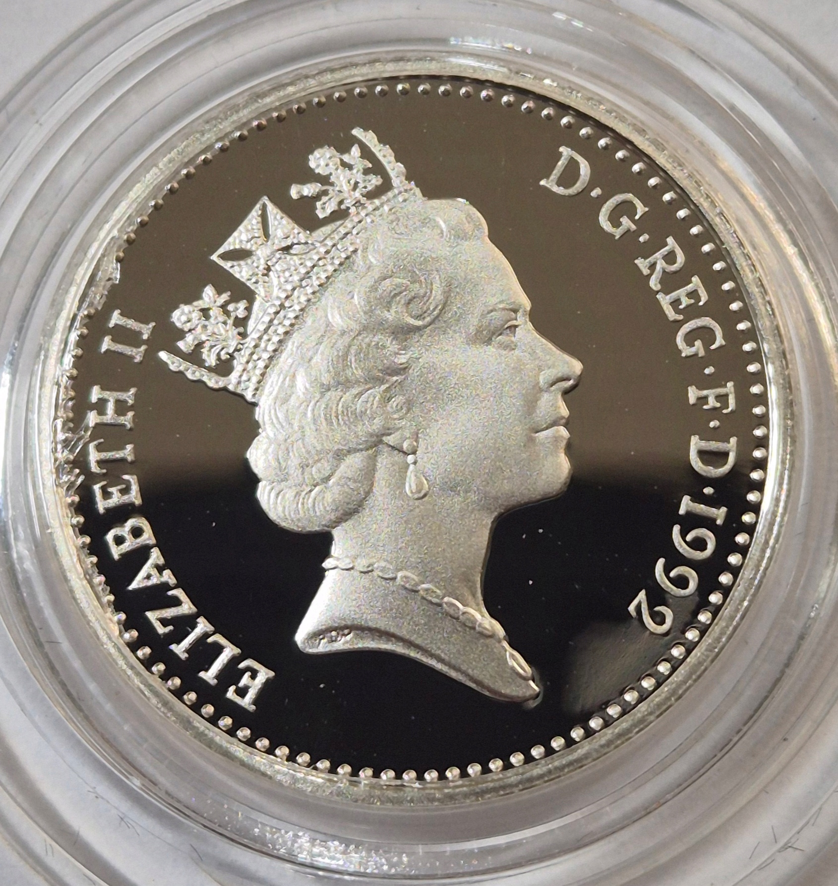 Унікальна копія британської монети з 10 ручок з 1992 року, вразила якість докази . Монета не з'являлася в регулярному обігу у Сполученому Королівстві - вона була випущена лише як частина наборів Королівського монетного двору, що робить її рідкісною і бажаною позицією серед нумізматики.