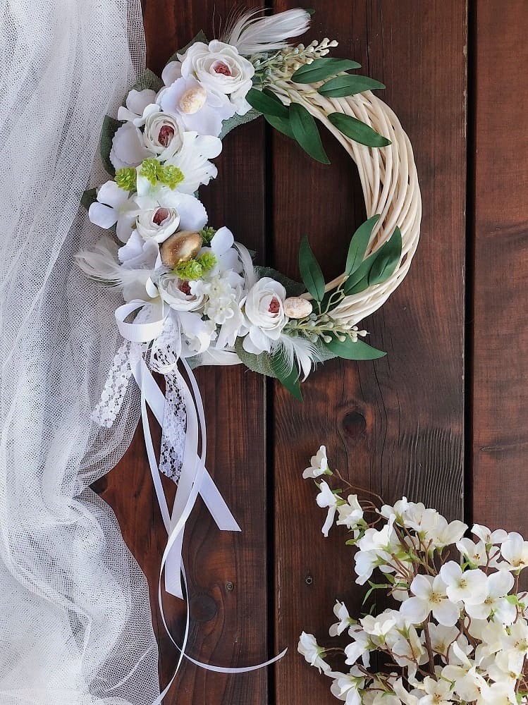 Великодній віночок із білих кульок, гортензій та різноманітних аксесуарів та листочків.
