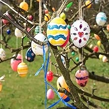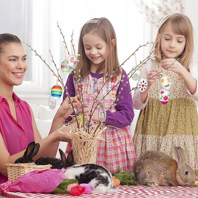 Кожне яйце має отвори для підвішування, тож ви можете легко прикрасити ними дерева, вікна, двері чи вінки.