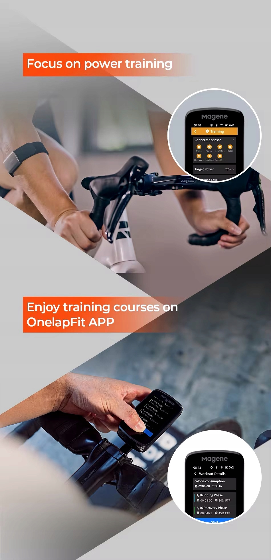 - OnelapFit APP – це професійна програма для велотренування та аналізу даних. Він містить 38 елементів даних і 15 діаграм, завдяки яким всебічно та професійно представляє та аналізує дані велосипедного руху. Автоматичний обмін даними на таких популярних платформах, як STRAVA та TrainingPeaks