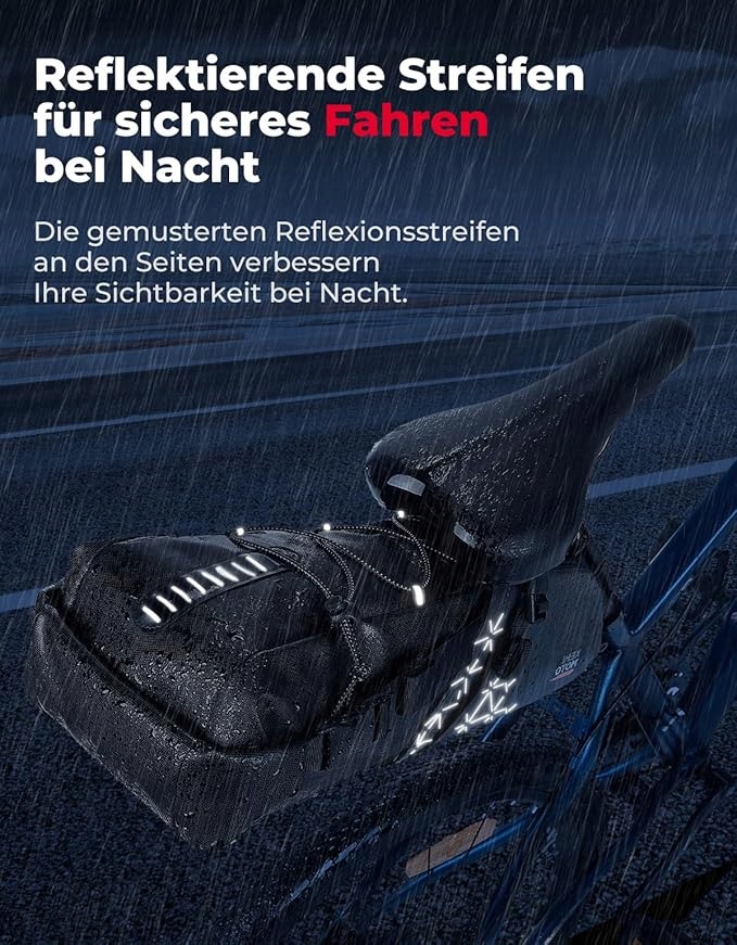 Покращена видимість вночі - світловідбиваючі смуги покращують видимість в умовах слабкого освітлення. Цей мішок для велосипедного сидіння служить бризковиком під час сильного дощу та зменшує потрапляння бризок на ваш одяг.