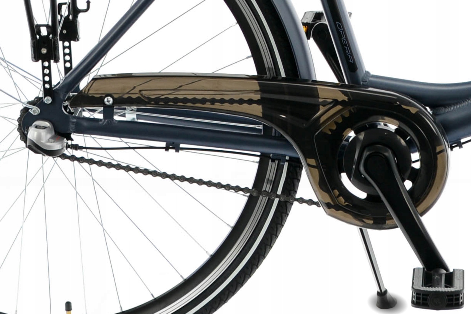 Це твердий польський велосипед з алюмінієвою рамою на колесах 28". Конструкція рами та регульована опора керма забезпечують високий комфорт їзди у вертикальному положенні. Ця модель має безвідмовну 3-швидкісну втулку Shimano Nexus.
