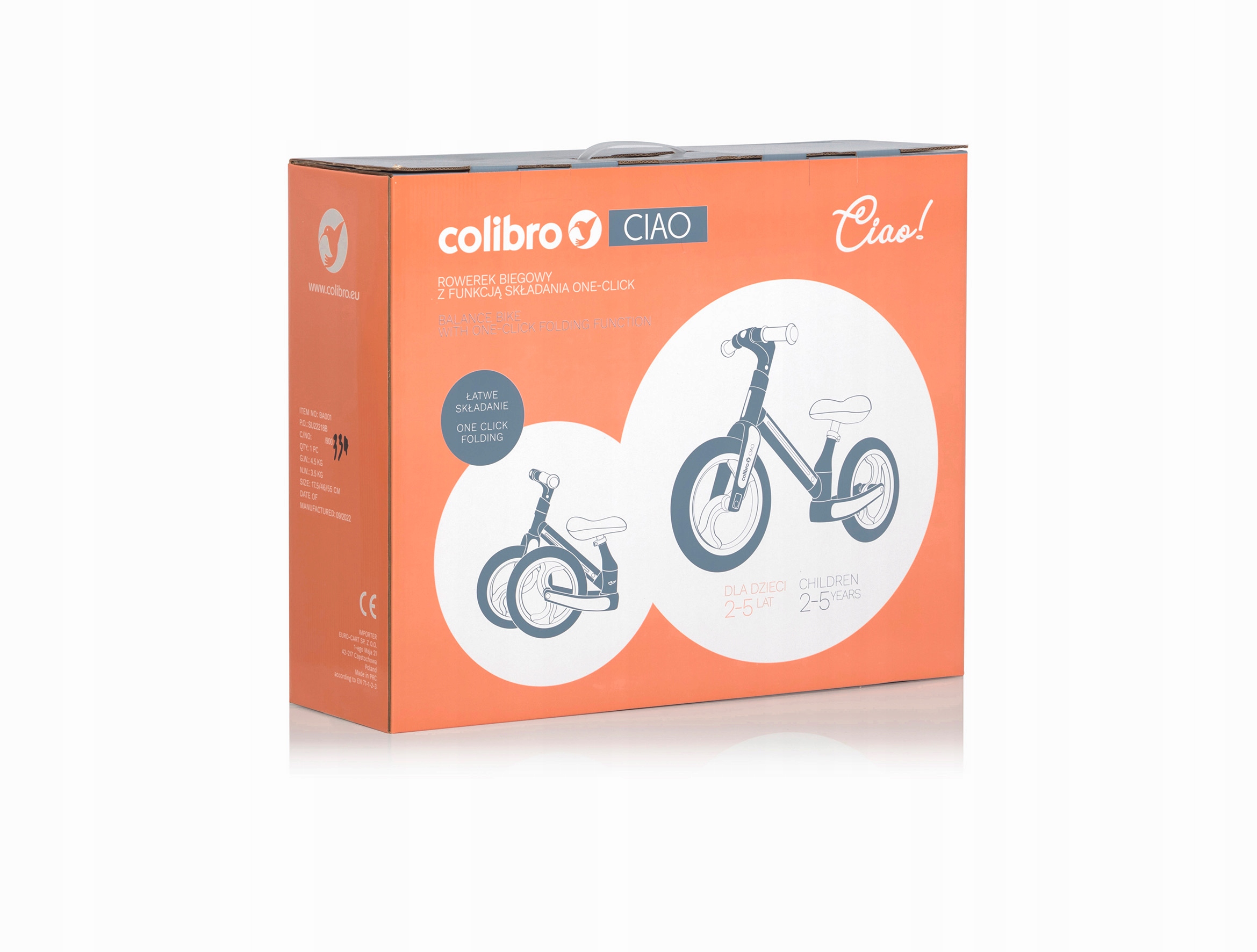 Завдяки регулюванню висоти сидіння та керма велосипед CIAO призначений для дітей віком від 2 до 5 років і вагою до 25 кг< /b > відповідно до європейського стандарту безпеки EN 71-1-2-3.