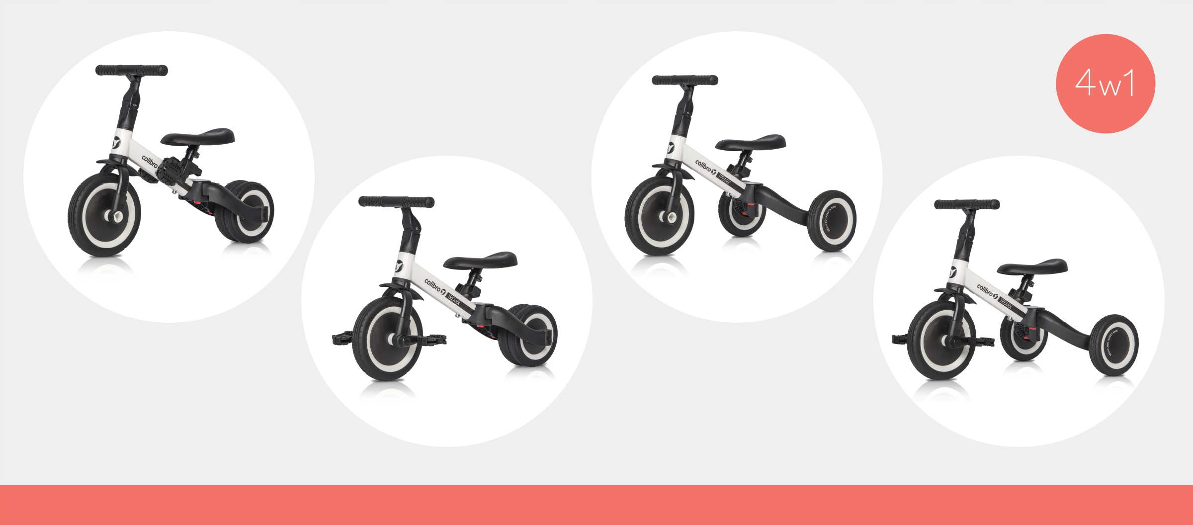 - Версії велосипедів: 4 в 1, триколісний велосипед (від 1 до 2 років дитини), триколісний велосипед (від 2 до 3 років), балансир (від 3 до 4 років) років), триколісний велосипед, двоколісний велосипед