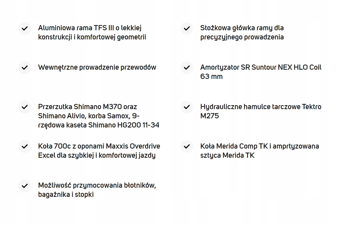 Універсальний кросовий велосипед із легкою та жорсткою алюмінієвою рамою зі зручною геометрією. Має амортизатор SR Suntour NEX HLO Coil, привід Shimano 3x9, колеса 700c, може бути оснащений крилами, стійкою та підставкою. Продовжуйте з Merida Crossway 100!