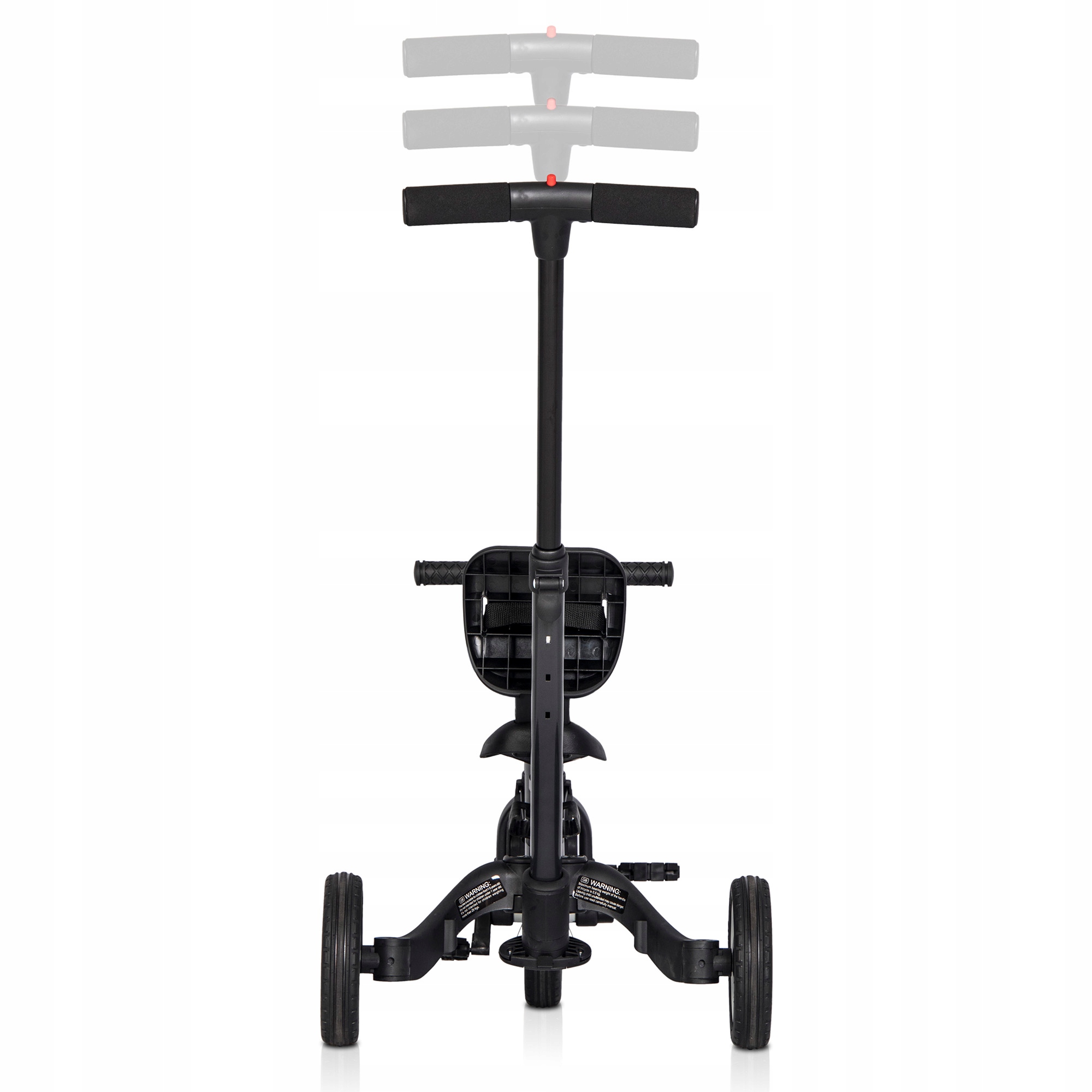 Двоколісний велосипед з штовхачем - для дітей від 4 до 5 років років. Коли дитина вчиться самостійно кататися на велосипеді, важливо, щоб у батьків була можливість підстрахувати дитину. Завдяки штовхачу, встановленому на задній частині велосипеда, батьки можуть утримувати велосипед у вертикальному положенні, коли дитина втрачає рівновагу. У цій конфігурації педалі встановлені на переднє колесо, задні колеса підключені, а сідло та кермо регулюються за зростом дитини. Це останній етап навчання їзді.