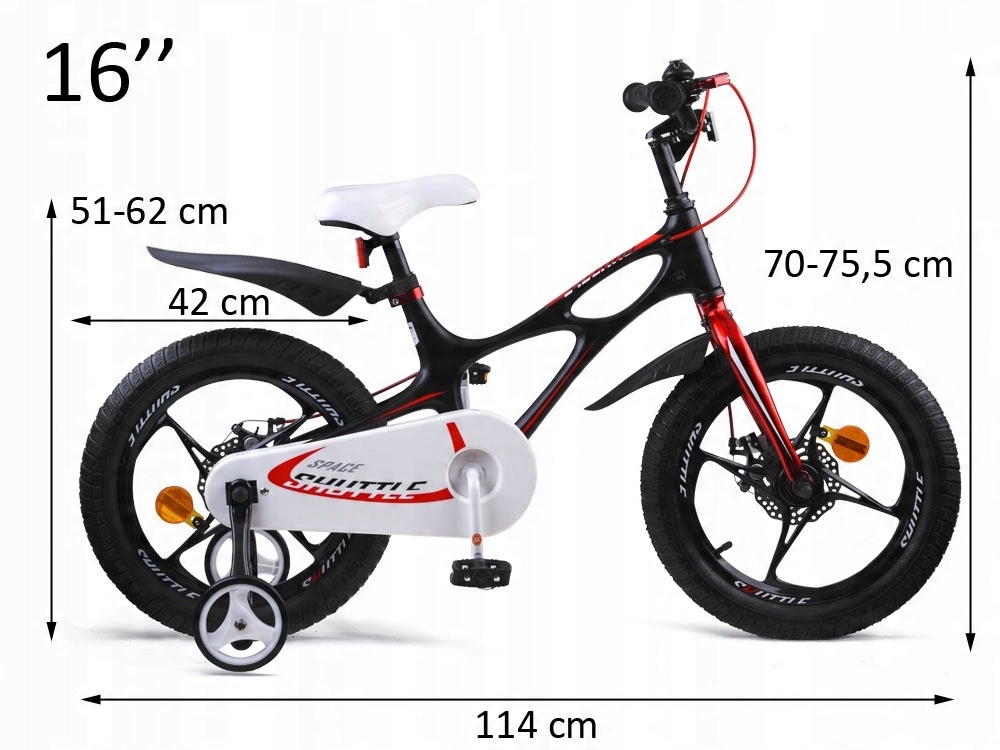 Велосипед від відомої компанії Royal Baby Space Shuttle 16" - це перший високоякісний велосипед для ентузіаста двох коліс, ідеальний для справжнього катання на задньому дворі. Магнієва легка рамаз вигнутою поверхнею та плавними лініями. Регульоване кермо, професійно спрофільоване з безпечними гумовими ручками, із закритою кришкою регулювання та дзвінком. Зручне сідло, Колеса 16 дюймів, подвійна гальмівна система з подвійними дисковими гальмами забезпечують комфортну та стабільну їзду, що полегшує дитині навчання самостійної їзди. Відстань між кермом, сідлом і педалями дозволяє дитині безпечно відпочити на очах у власника та друзів пропорційно підтримуються, що забезпечує плавну та комфортну їзду.