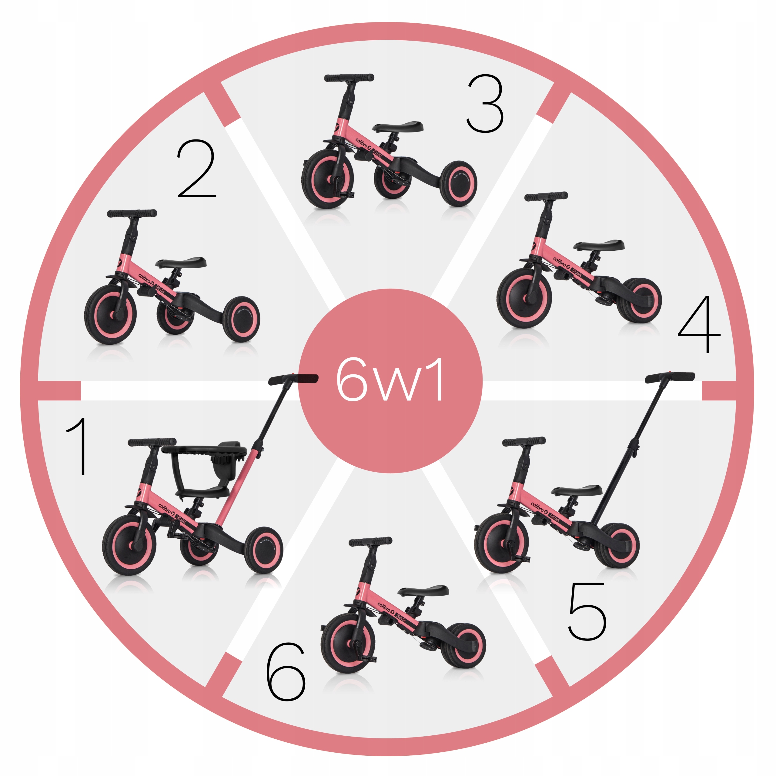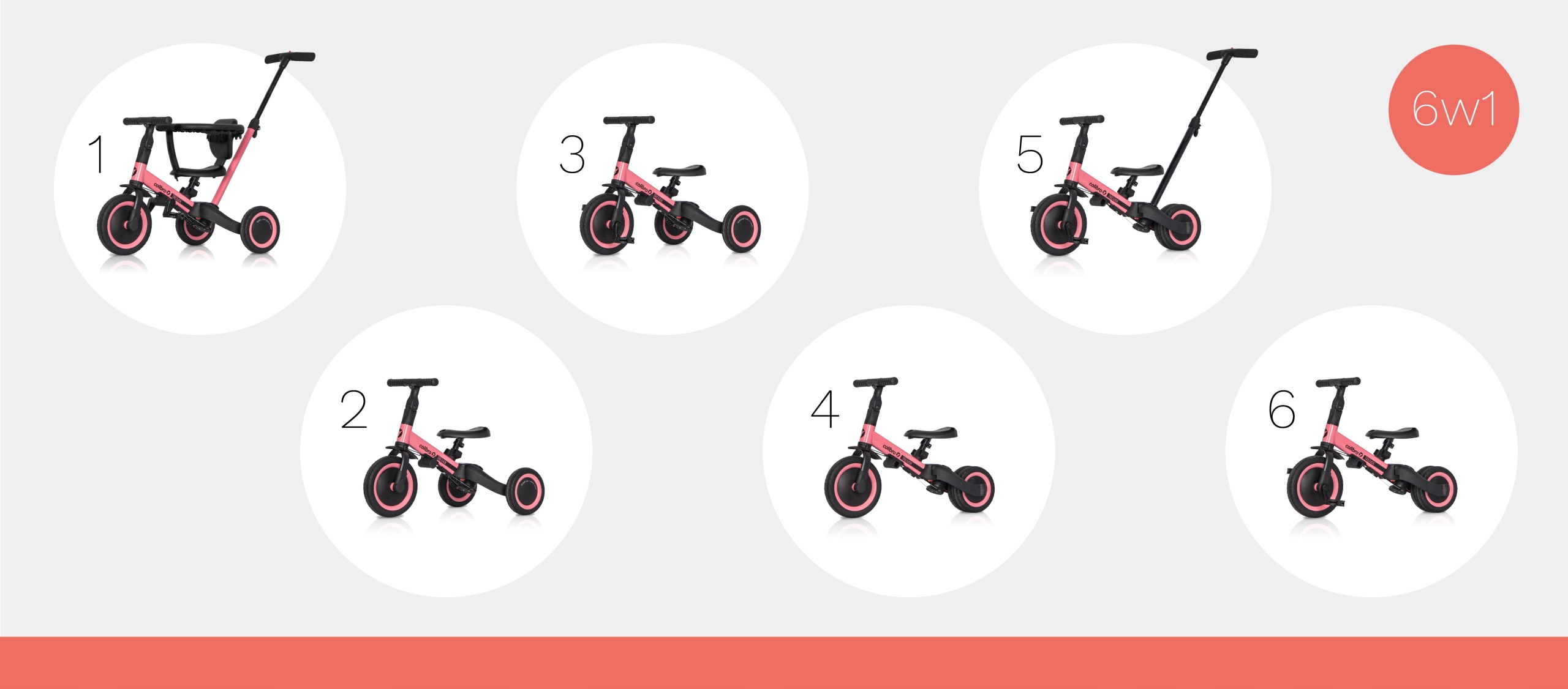 - Версії велосипеда: 6 в 1, коляска (від 1 до 2 років), триколісний велосипед (від 1 до 2 років) дитина), триколісний велосипед (від 2 до 3 років) ,велосипед (від 3 до 4 років), велосипед, двоколісний велосипед з штовхачем (від 4 до 5 років), два -велосипед на колесах
