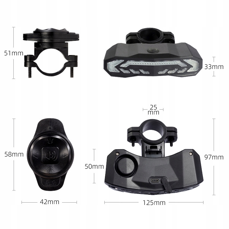 Заднє світло велосипеда з тривогою оснащений датчиком руху. Якщо злодій велосипеда пошкоджує ваш велосипед або намагається взяти його, увімкнеться тривога 110 децибелів. Це попереджає цю територію, і злодій зазвичай негайно зупиняє злочин. Ступінь водостійкості IP65 і може використовуватися в дощову та сніжну погоду.