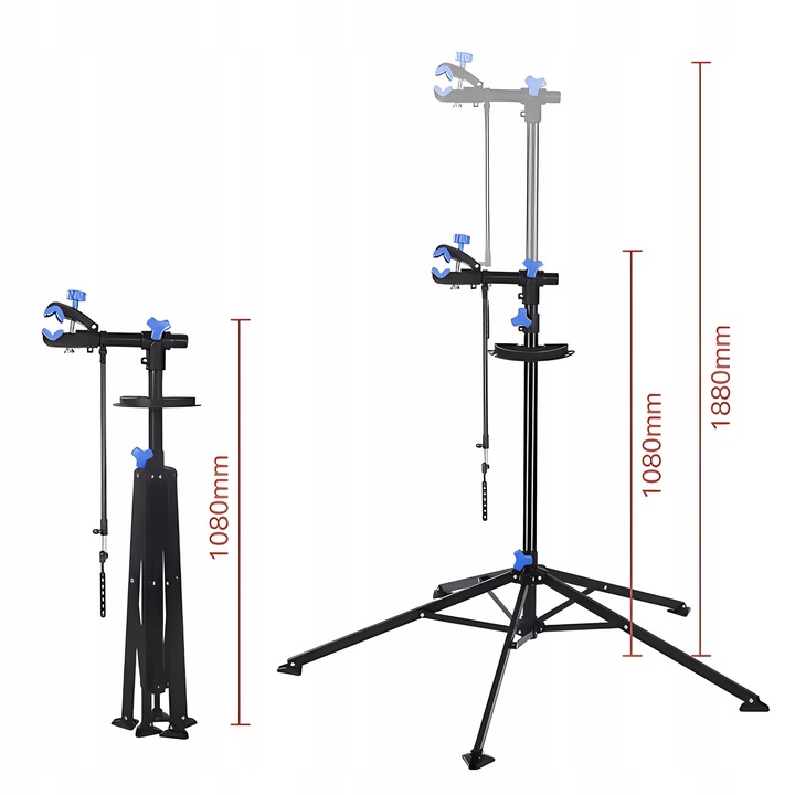 Можна відрегулювати висоту в діапазоні від 108 до 190 см, що дозволяє адекватною адаптацією залежно від ваших потреб. Це чудова гнучкість і зручність, які забезпечує стійка. Незалежно від того, чи ви обслуговуєте невеликий або великий велосипед, вам знадобиться лише одна стійка, оскільки вона легко адаптується до окремих уподобань користувача.