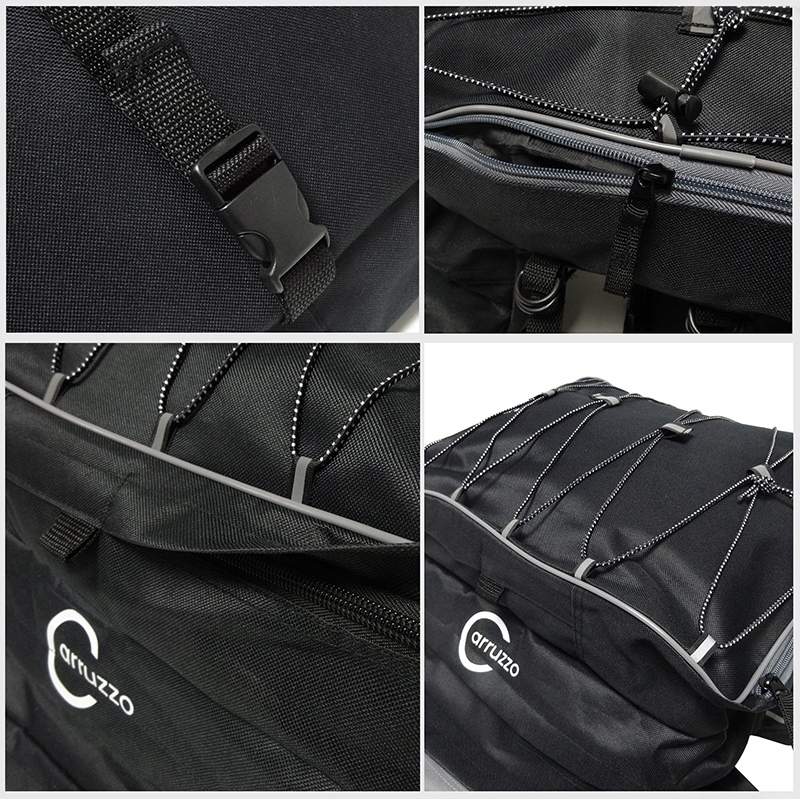 Пропонована велосипедна сумка, встановлена на стійку, є ідеальним рішенням для повсякденного використання та для тривалих поїздок на вихідні. Завдяки тому, що він надзвичайно місткий, в ньому можна розмістити всі необхідні під час велосипедної подорожі речі, такі як: спальний мішок, намет, змінний одяг і взуття, косметику, інструменти, продукти харчування, зручні дрібнички і т. д. Всього має 8 кишень і рюкзак у верхній частині - еластичні стрічки зі шнурками для великих вантажів. Це дає великі можливості для пакування.