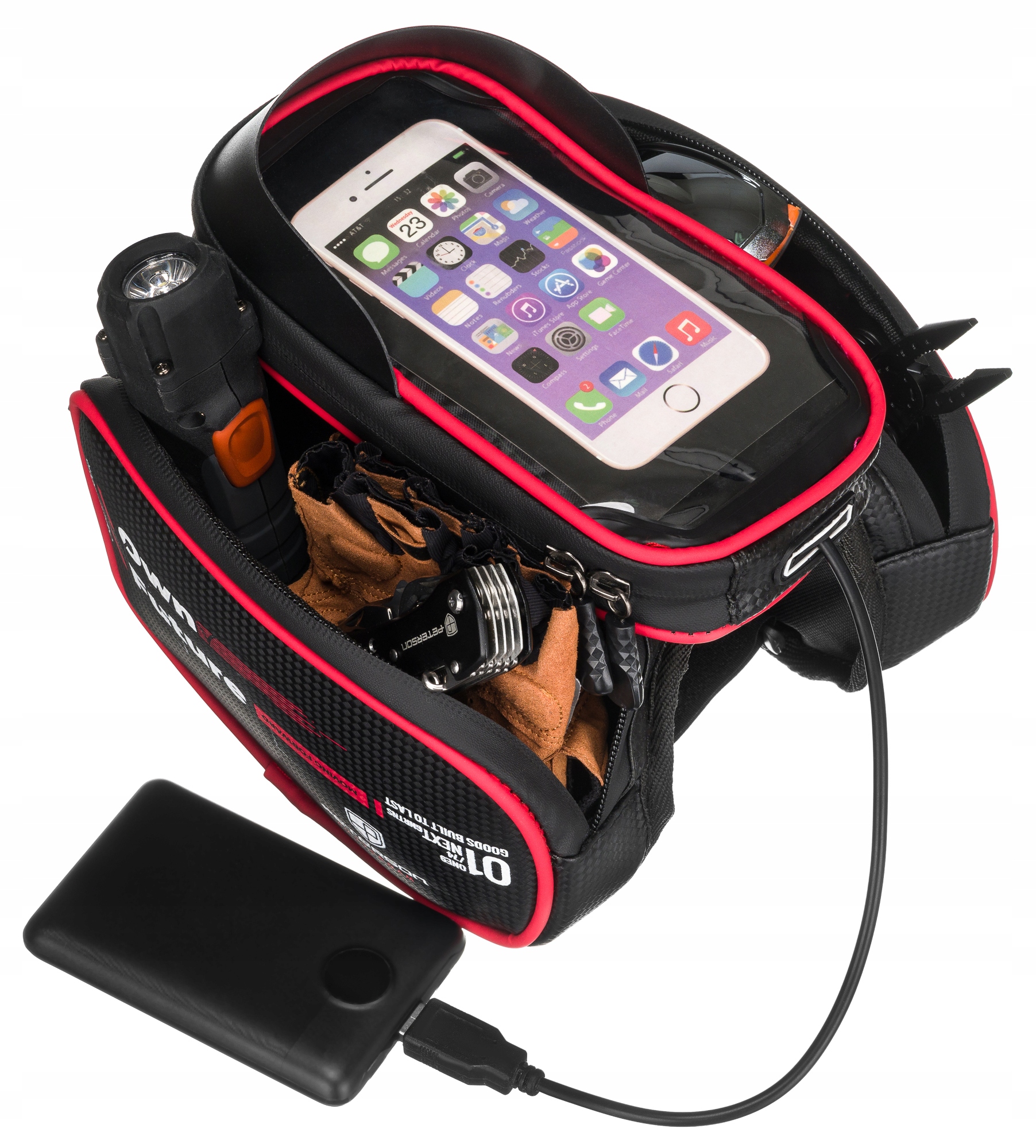 Водонепроникна сумка для рами велосипеда, завдяки якій можна перевозити дрібні предмети, такі як ключі, гаманець, навушники. Оснащений прозорим відділенням для смартфона (максимальна діагональ: 6,7 дюйма). Кріпиться на кермо за допомогою липучок. Ідеально підходить для кожного любителя двоколісних автомобілів.